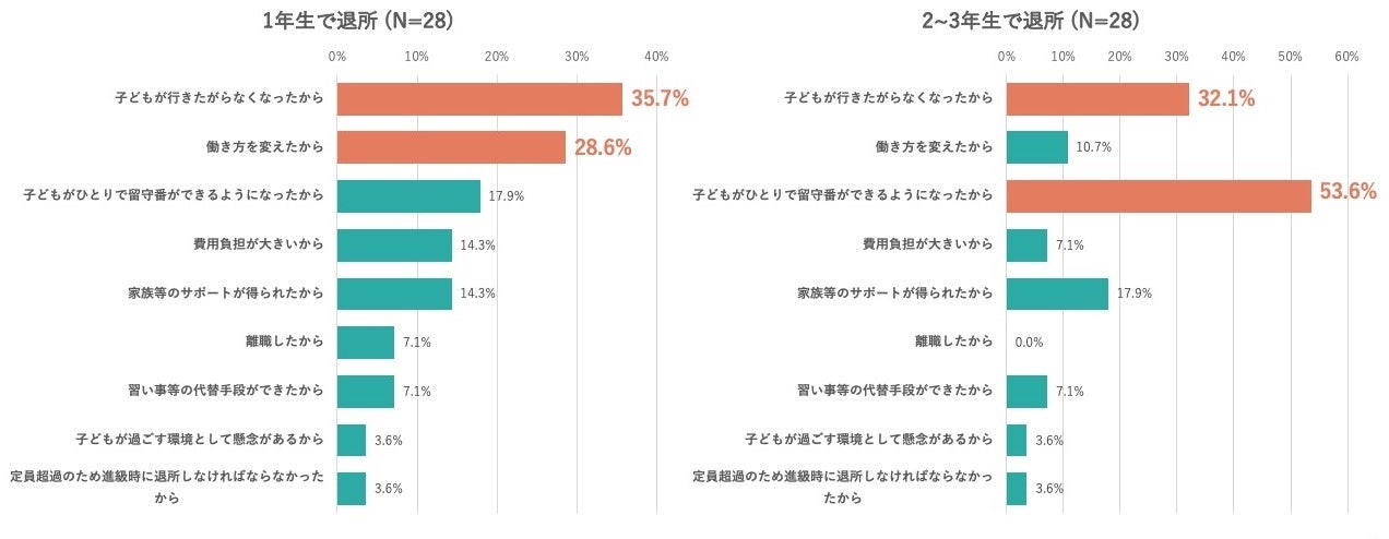 退所者においても、退所理由は「子どもが行きたがらなくなったから」が1年生では最多(35.7%)、次いで「働き方の変更」(28.6%)となりました。一方、2〜3年生の退所者は「子どもがひとりで留守番できるようになったから」(53.6%)、「子どもが行きたがらなくなったから」(32.1%)が多い傾向にありました。