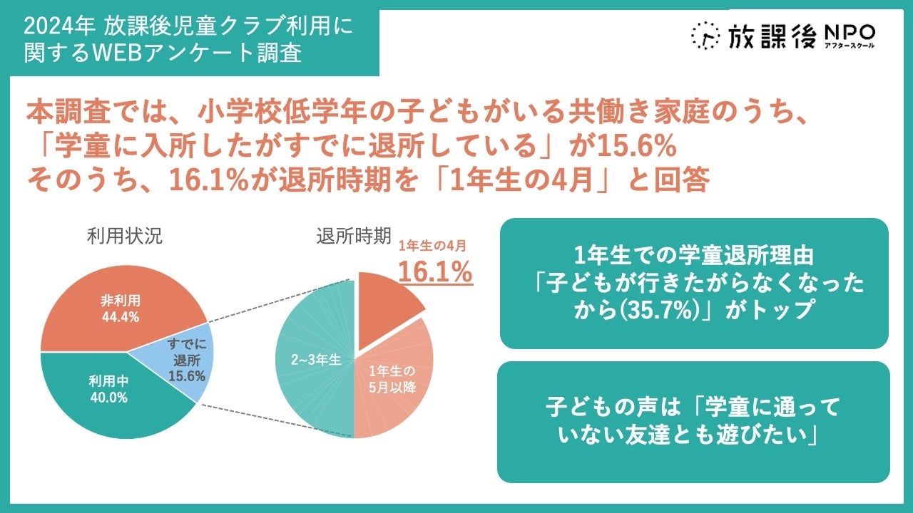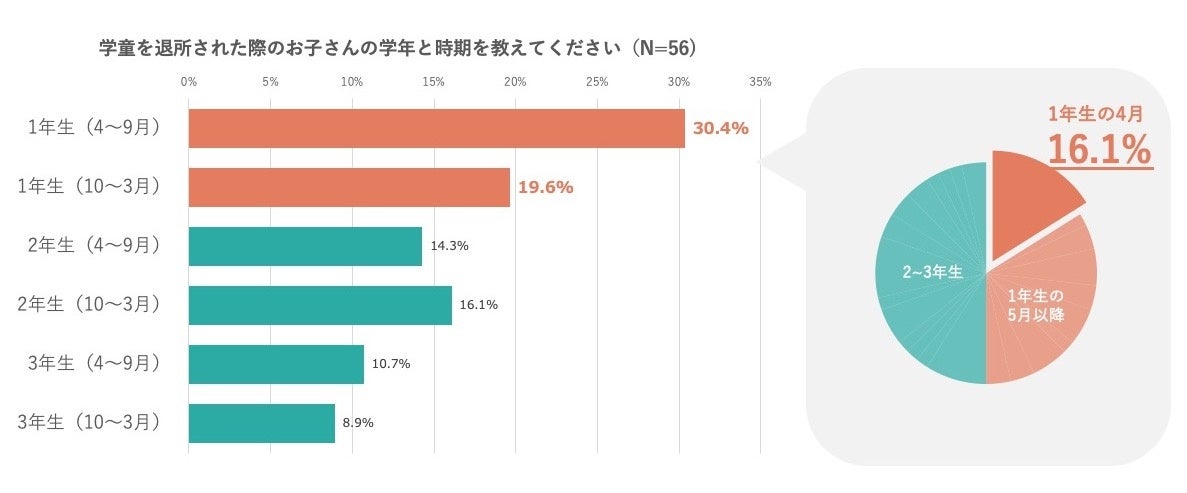 【放課後児童クラブの利用について|独自調査結果発表】低学年共働きで学童退所者は全体の15.6%、うち1年生前半の退所は30.4%(16.1%は1年生の4月)