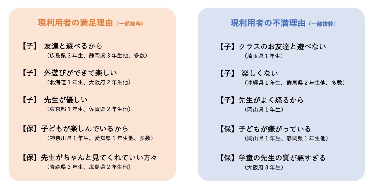 現利用者の「学童に満足していない」理由や退所者の退所理由を子どもに聞くと、共通して「楽しくな