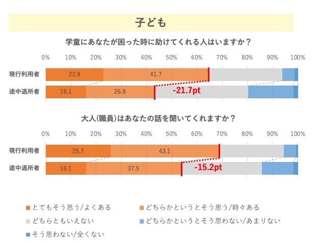 保護者・子どもの項目別評価を現利用者と退所者で比較したところ、退所者の評価が著しく低かった項目は、子どもでは「困った時に助けてくれる人がいる(-21.7pt)」「大人(職員)が話を聞いてくれる(-15.2pt) 」となりました。