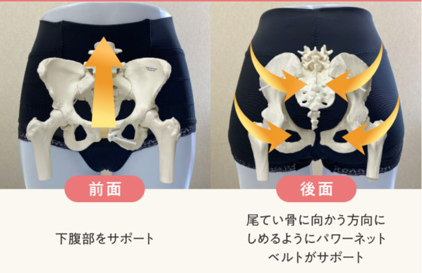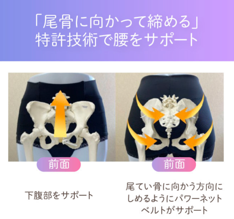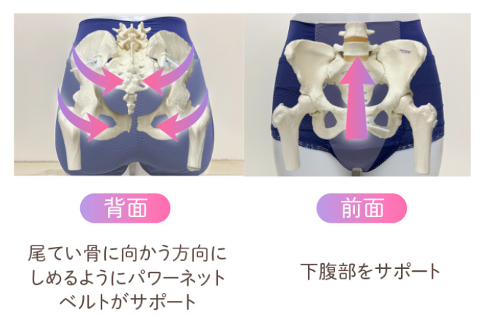 前面は下から上に下腹部をサポートし、後面は尾てい骨に向かう方向に締めるようにパワーネットベルトでサポートします。ほどよい引き締め感なので、眠りをさまたげることなく就寝時でも快適に着用していただけます。