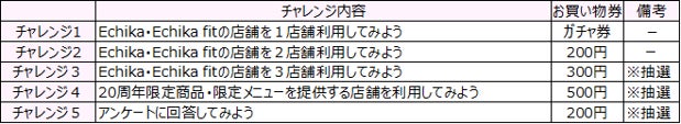 各店舗をご利用時に二次元コードを読み込むと、LINEミニアプリ上でチャレンジ達成に必要なスタンプがもらえます。スタンプを集めてチャレンジを達成すると、もれなく200円のデジタルお買物券を進呈。チャレンジ内容に応じた賞品を抽選でプレゼントいたします。さらに今回は、20周年を記念しエチカちゃんオリジナルグッズがもらえるガチャガチャの参加券もプレゼント!