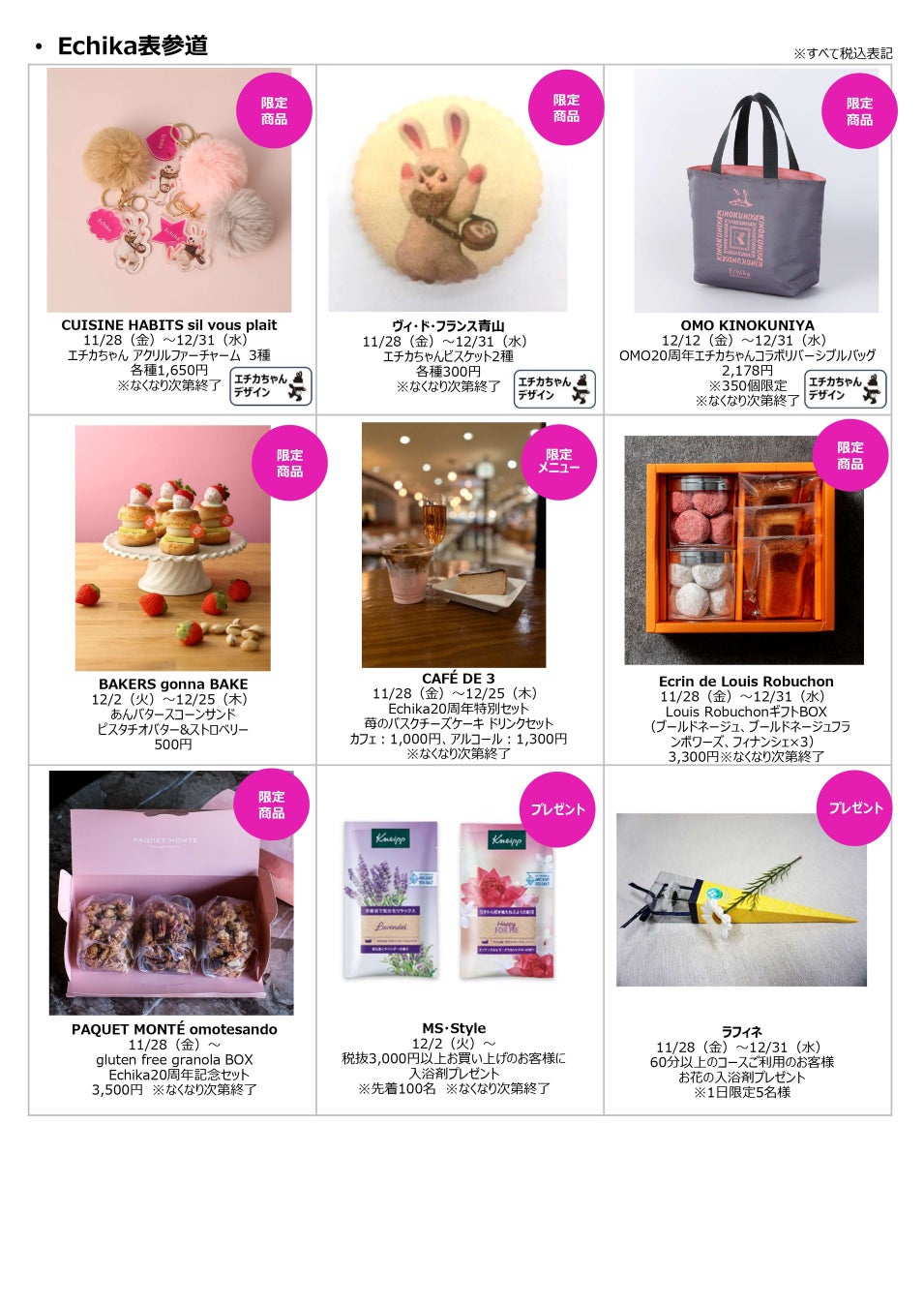 20周年を記念して、エチカちゃんデザイン商品をはじめ、期間限定商品や限定メニュー、限定サービスをEchikaの各施設、各店舗にて販売いたします。