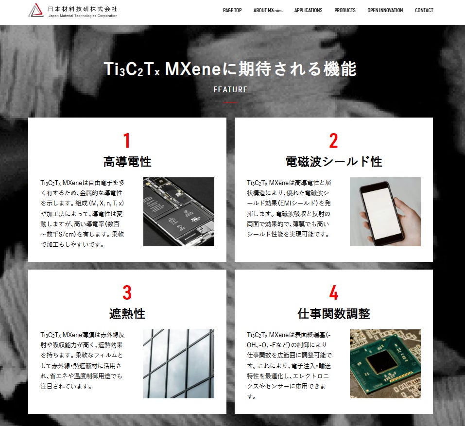 日本材料技研株式会社(本社:東京都中央区、代表取締役社長 浦田 興優、以下「当社」)は、当社が取り扱う次世代導電性材料「Ti3C2Tx MXene」の特設Webサイト(URL:https://mxene.jmtc.co.jp/、以下「本サイト」)を公開したことをお知らせいたします。