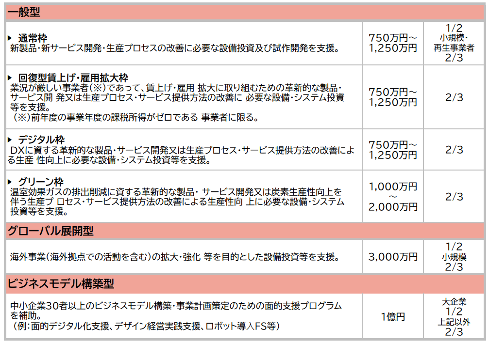 また、第11次の事業類型(申請枠)は下表の通りとなっており、事業者の様々な取り組みに対応しています。