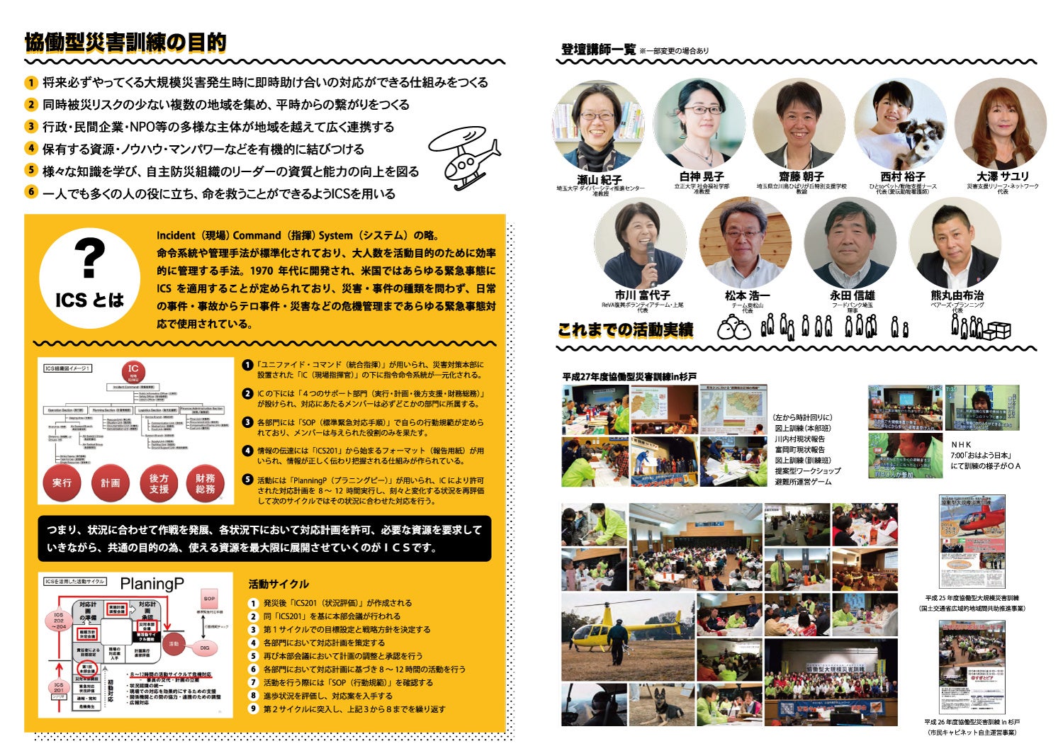 協力 埼玉県(危機管理課/共助社会づくり課/社会施設課)、埼玉県社会福祉協議会、杉戸町社会福祉協議会、一般社団法人ひとtoペット、動物支援ナース、 埼玉大学 ダイバーシティ推進センター、立正大学 社会福祉学部、埼玉県立川島ひばりが丘特別支援学校、埼玉県災害ボランティア団体ネットワーク「彩の国会議」、 災害支援リリーフ・ネットワーク、ReVA復興ボランティアチーム・上尾、NPO法人チーム東松山、若者のふくし教育研究会、NPO法人フードバンク埼玉、 ベアーズ・プランニング、全日本救助犬団体協議会、公益社団法人ユ二バーサル志縁センター、ビブリオテカ オカルタ、NPO法人埼玉県キャンプ協会、株式会社測設、 防災まちづくりの会・東久留米、株式会社ホワイトボックス、まちひとサイト(東京等中央区社会福祉協議会)、公益財団法人日本財団、NPO法人NPO埼玉ネット、NPO法人すぎとSOHOクラブ、NPO法人日本社会事業協会、他