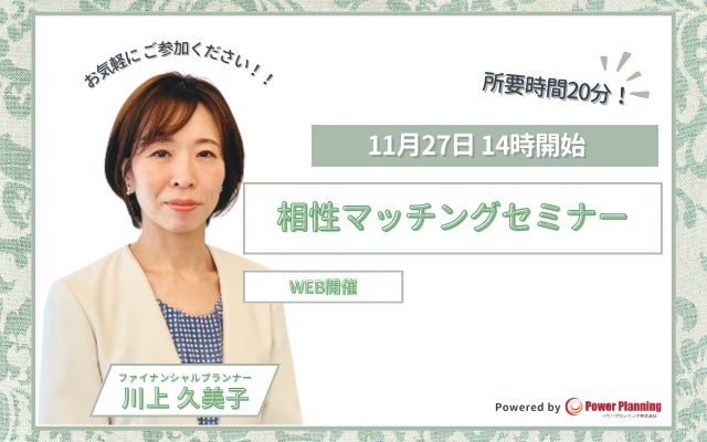 無料マネーセミナー提供サービス「アットセミナー」を運営しているパワープランニング株式会社が「11月27日(水) 14時」に川上 久美子講師によるオンラインの相性マッチングセミナー開催を実施いたします。