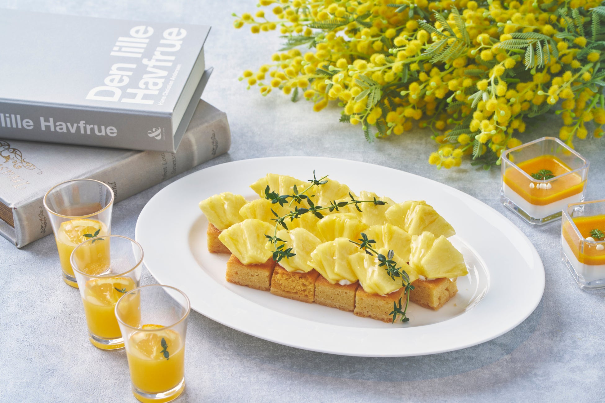 さらに、ステーキ&シーフード【シスクグリル】にて提供する『ホワイトアスパラガスとハーブガーデンサラダ』(※2)は、丁寧に煮込んだやんばる産豆ラグーを使用し、今が旬のホワイトアスパラガス、フレッシュハーブサラダ、沖縄県産の甘みの強い金美人参、豆乳とペコリーノチーズを使用したソースで、ハーブの爽やかさとチーズの濃厚な味わいを楽しめる一皿です。イタリアンレストラン【セマーレ】にて提供する『赤座海老とイベリコチョリソー、島野菜のサフランリゾット』(※3)は、浅利と昆布から取った出汁でイタリア産の熟成米をサフランの香り豊かなリゾットに仕上げております。赤座海老のグリルとイベリコチョリソーと一緒に召し上がることで、味のハーモニーをお楽しみいただけます。オールデイダイニング【アマハジ】にて提供する『パイナップルタルト』(※4)は、パイナップルの果肉をたっぷり味わえ、バターとアーモンドの香ばしさ、そしてサクサクした食感のタルト生地とのコラボレーションをお楽しみいただけます。
