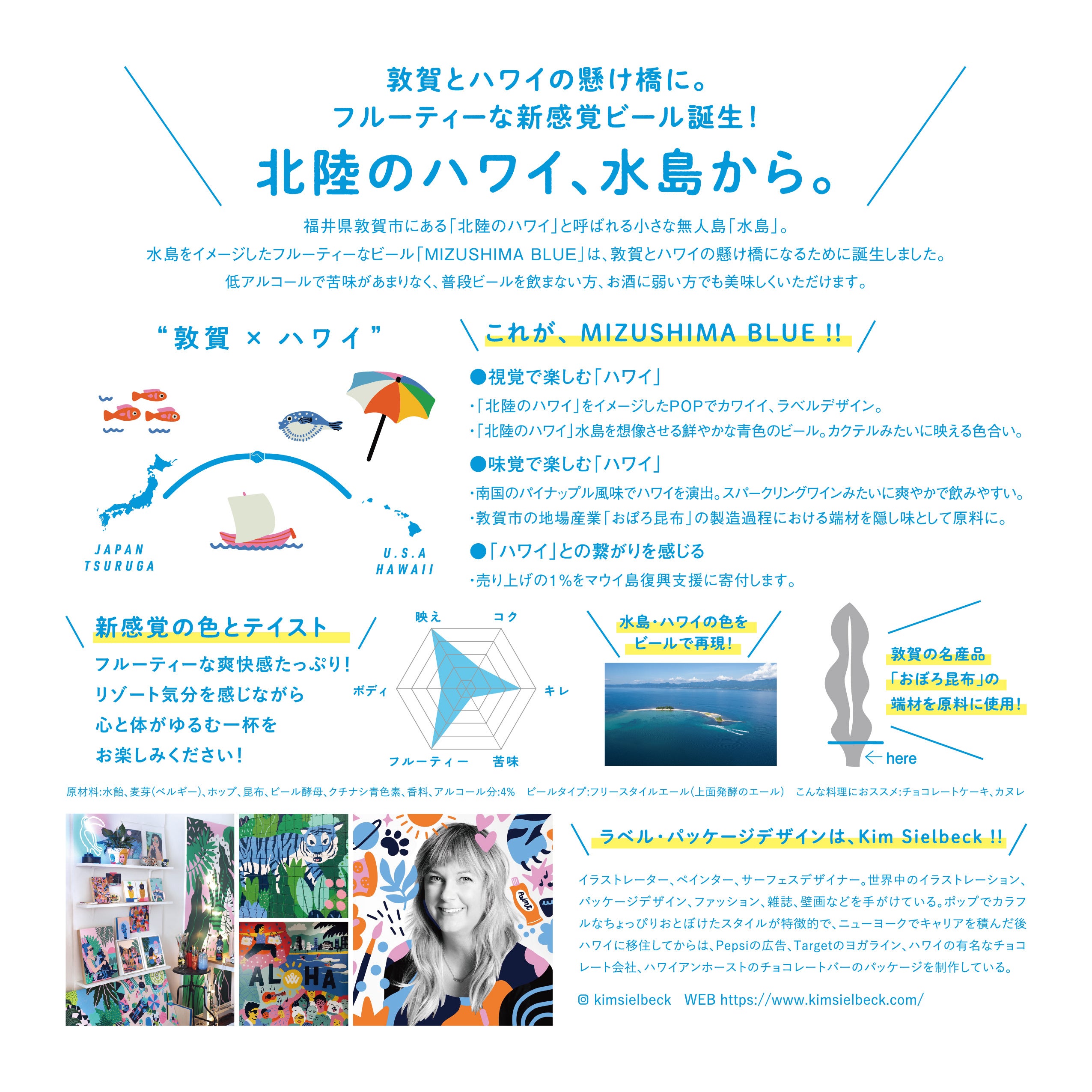 そうした活動の中で、2024年に北陸新幹線敦賀開業記念として「北陸のハワイ」水島をテーマにしたクラフトビールを発売。今回はその人気シリーズの第2弾となります。今回のラベル、パッケージデザインは、ハワイでも人気のデザイナー SUZANNE JENNERICH。スザンヌらしい、カラフルでポップなデザインと、水島を想像させる透き通った青色のドリンクは、見るものを瞬く間にハッピーにしてくれ、アロハがたくさん詰まった、SNSに投稿したくなるインパクトのある商品としております。また、クラフトビール同様、本商品も敦賀とハワイの懸け橋ビールとして、年間の売り上げの1%をマウイ島復興支援に寄付します。
