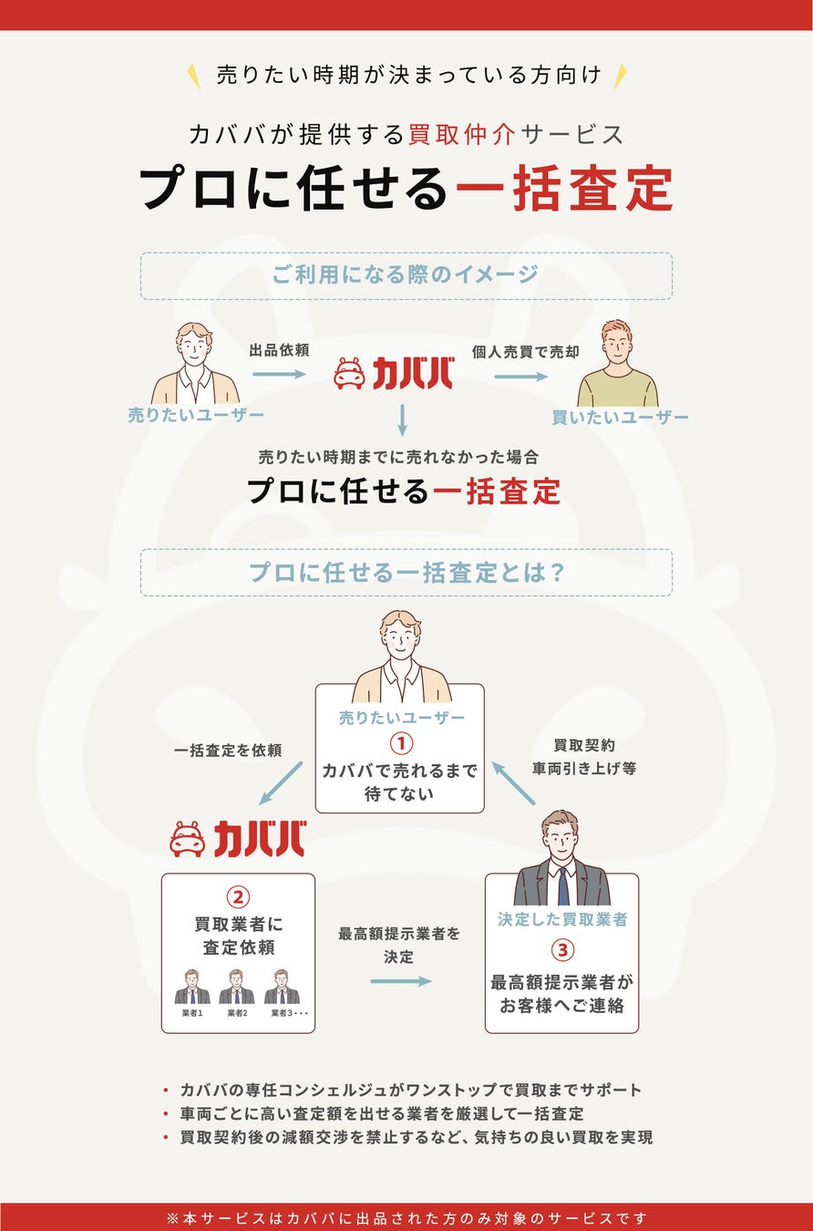 それに伴い、自動車フリマサービス『カババ』にご出品依頼いただいたお車が、指定した期間までに売却できない場合、当社が車ごとに得意な買取業者を全国から選定して、日本一高い買取価格を提示できる業者を無料で紹介します。