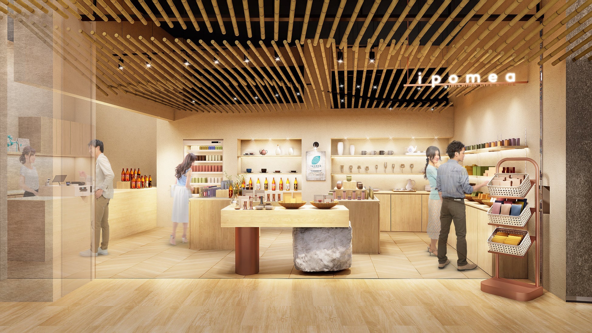 「KIRISHIMA GREENSHIP icoia」に入る霧島酒造の直営店舗「KIRISHIMA LIFE STORE ipomea」では、訪れたお客様の暮らしがもっと美味しく、もっと自由に、もっと幸せになれるヒントをご提供できるよう、霧島焼酎やKIRISHIMA BEERをはじめ、お酒のシーンが楽しみになるような食品や酒器、雑貨などを販売します。内装は自然木やシラス壁(火山灰)を使った温かみあふれるデザインとなっており、テーブルの一部には、さつまいもが日本に最初に伝わった場所とされる沖縄県の琉球石灰岩を使用しています。霧島酒造だからこそお届けできる焼酎の楽しみ方や新たなカルチャーを発信することで、これまで焼酎に馴染みのなかった方にも、「焼酎」という存在をもっと身近に感じていただきたいと考えています。