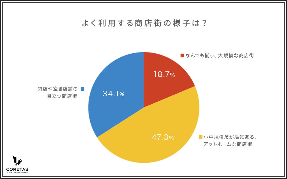 よく利用する商店街の様子については、「なんでも揃う、大規模な商店街」18.7%、「小中規模だが活気ある、アットホームな商店街」47.3%、「閉店や空き店舗の目立つ商店街」34.1%となりました。(「利用しない」を除く数字)