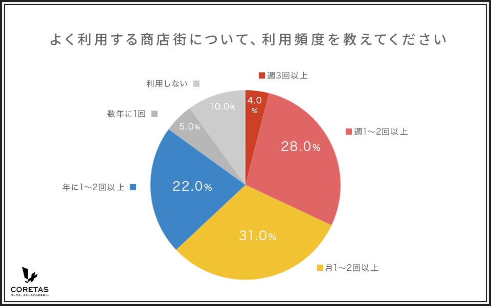 利用頻度については、「週3回以上」4%、「週1~2回以上」28%、「月1~2回以上」31%と、過半数の人が一定の頻度で商店街を利用していました。