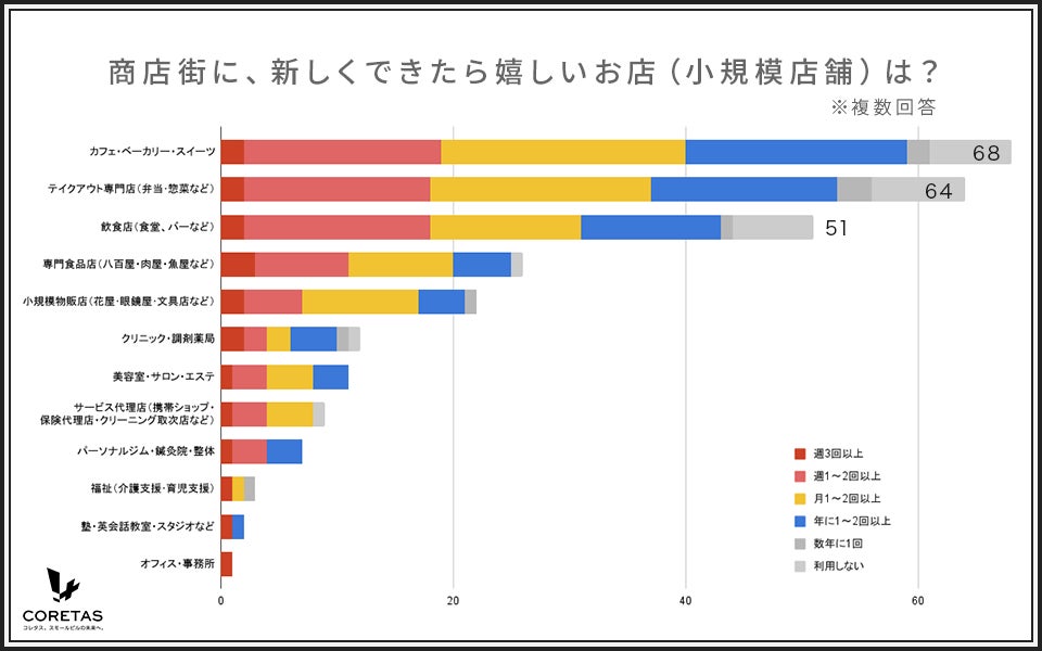 新しくできたら嬉しいお店は?と複数選択で尋ねたところ、「カフェ・ベーカリー・スイーツ」「テイクアウト専門店」「飲食店」が、商店街の利用頻度に関わらず、圧倒的な支持を集めました。