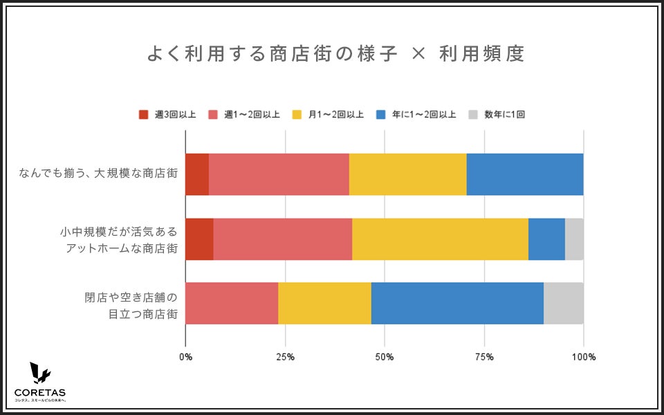 一方で「閉店や空き店舗の目立つ商店街」と回答した人の利用頻度は「年に1~2回以上」が最も多く、「数年に1回」の利用と合わせると、過半数にのぼりました。一方で、「週1~2回以上」利用する人も約4分の1いましたが、「週3回以上」の利用はありませんでした。
