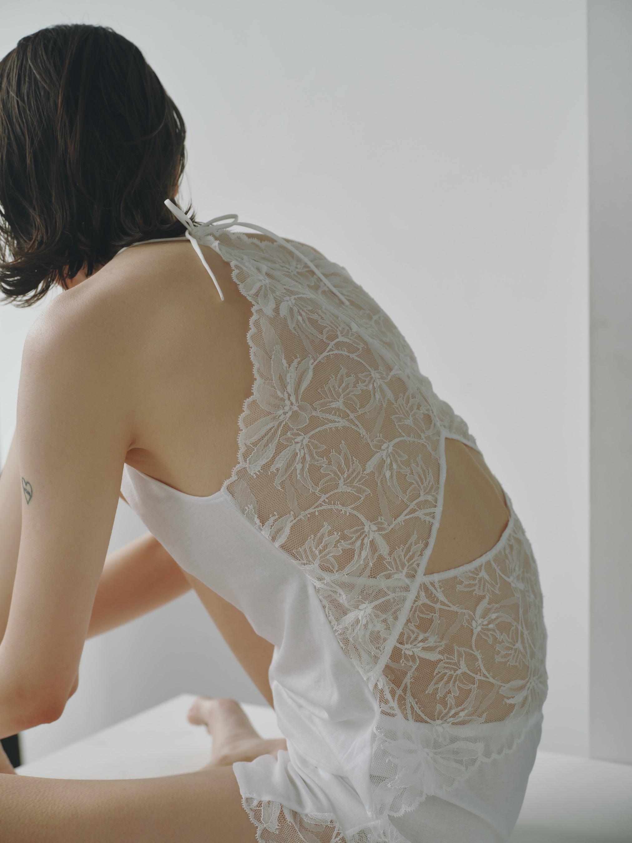 コットンシリーズの新作は、イタリア産Filoscozia(フィロスコッチア)コットン100双フライスに、リバーレースを組み合わせたラウンジウェア。極細綿糸の上品な光沢とほのかな透け感が、軽やかで洗練された印象をもたらします。背中にレースを配したキャミソールや、揺れ感の美しいサイドレースのフレアパンツに加え、同素材を用いたミニマルなデザインのロングスリーブも登場。リラックスシーンからワンマイルまで、美しく心地よく日常に溶け込むラインナップです。
