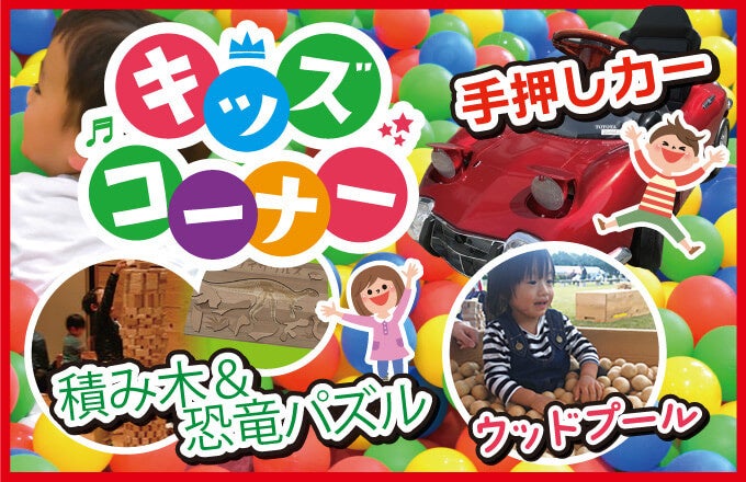 キッズコーナーには、ウッドボールのプール、恐竜のパズル、積木など、子供たちが喜ぶ玩具が目白押し。いずれも福井県産の木を使用した玩具だったこともあり、親子で安心して遊んでいただけました。「トヨタ2000GT」の手押し車も大人気。乗車しながら楽しく会場内を回遊していただけました。