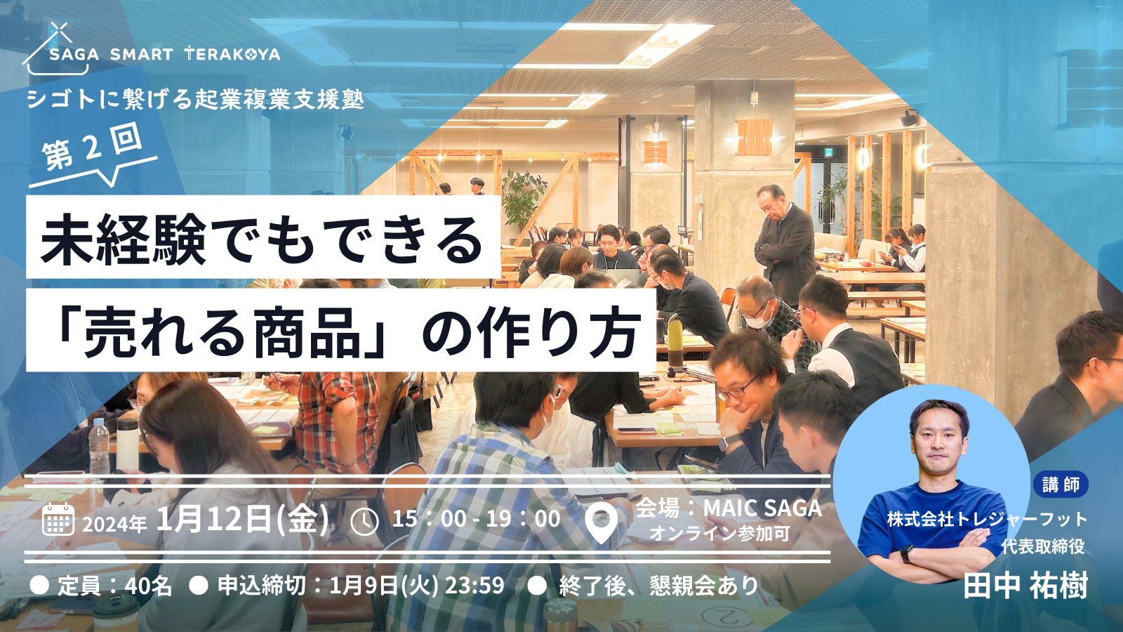 株式会社トレジャーフット(本社:神奈川県鎌倉市、 代表取締役 田中 祐樹)は、この度、佐賀県「令和5年度 IT人材起業・副業等活躍推進事業」を受託し、1月12日(金)に「未経験でもできる『売れる商品』の作り方」を開催いたします。