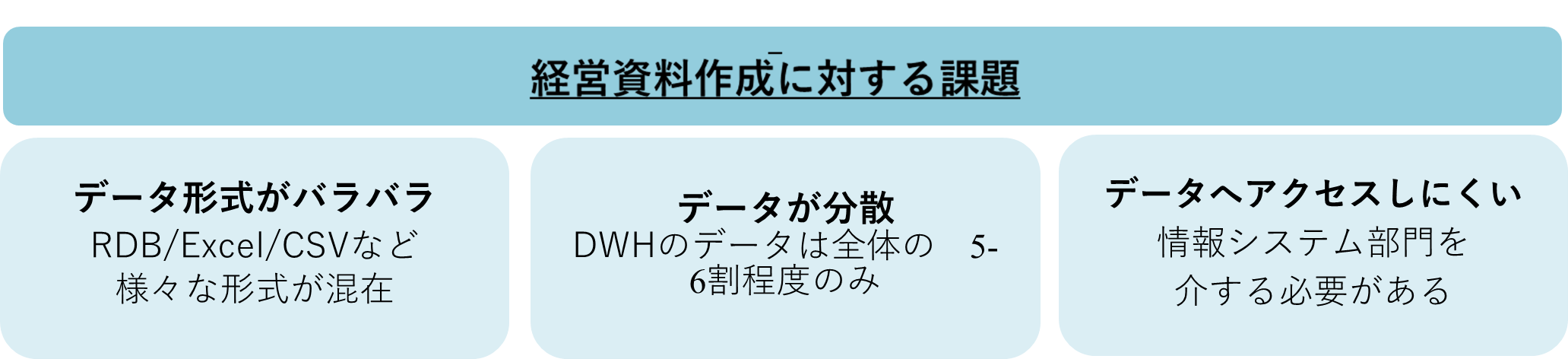 経営戦略部では、以前より経営報告資料の作成にかける工数の負担が大きく、本来すべき「DXの検討」や「別システムの構築」に費やす時間の確保が困難となっていました。また、必要なデータは情報システム部門へ共有を依頼するため、データ取得における多くの工数がかかっていました。