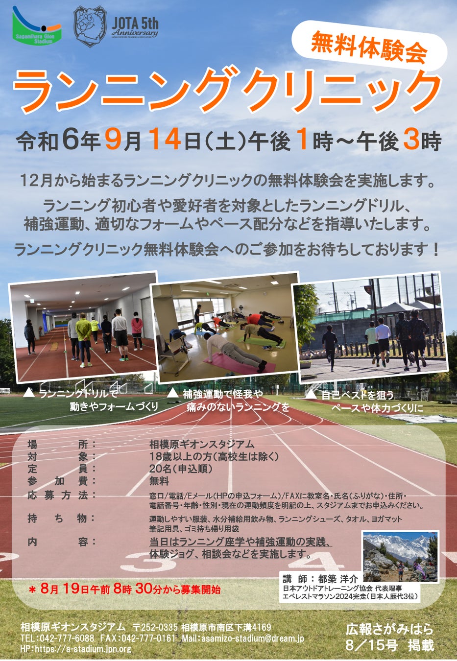日本アウトドアトレーニング協会は相模原市スポーツ協会グループとの共同主催で令和6年9月14日(土)13~15時の日時に「ランニングクリニック無料体験会」を開催いたします。このイベントは例年 "相模原ギオンスタジアム" で実施している「初心者向けランニングクリニック」に繋がる内容で、無料体験会は今回が初の試みです。
