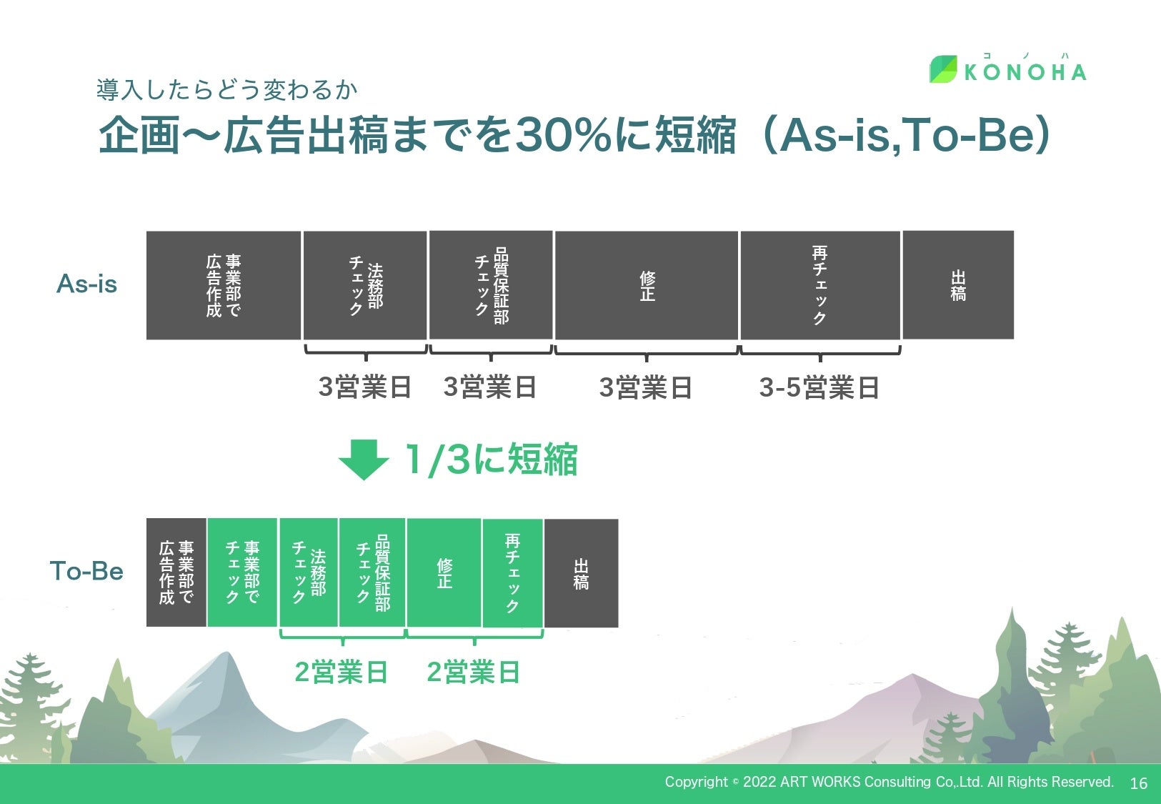KONOHAを導⼊することで、企画〜広告出稿までを約30%*に短縮することができます。