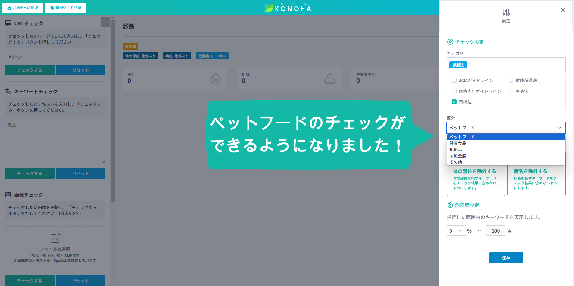 ※ペットフードの広告チェック機能はKONOHA AD ライトプランに標準実装されています。