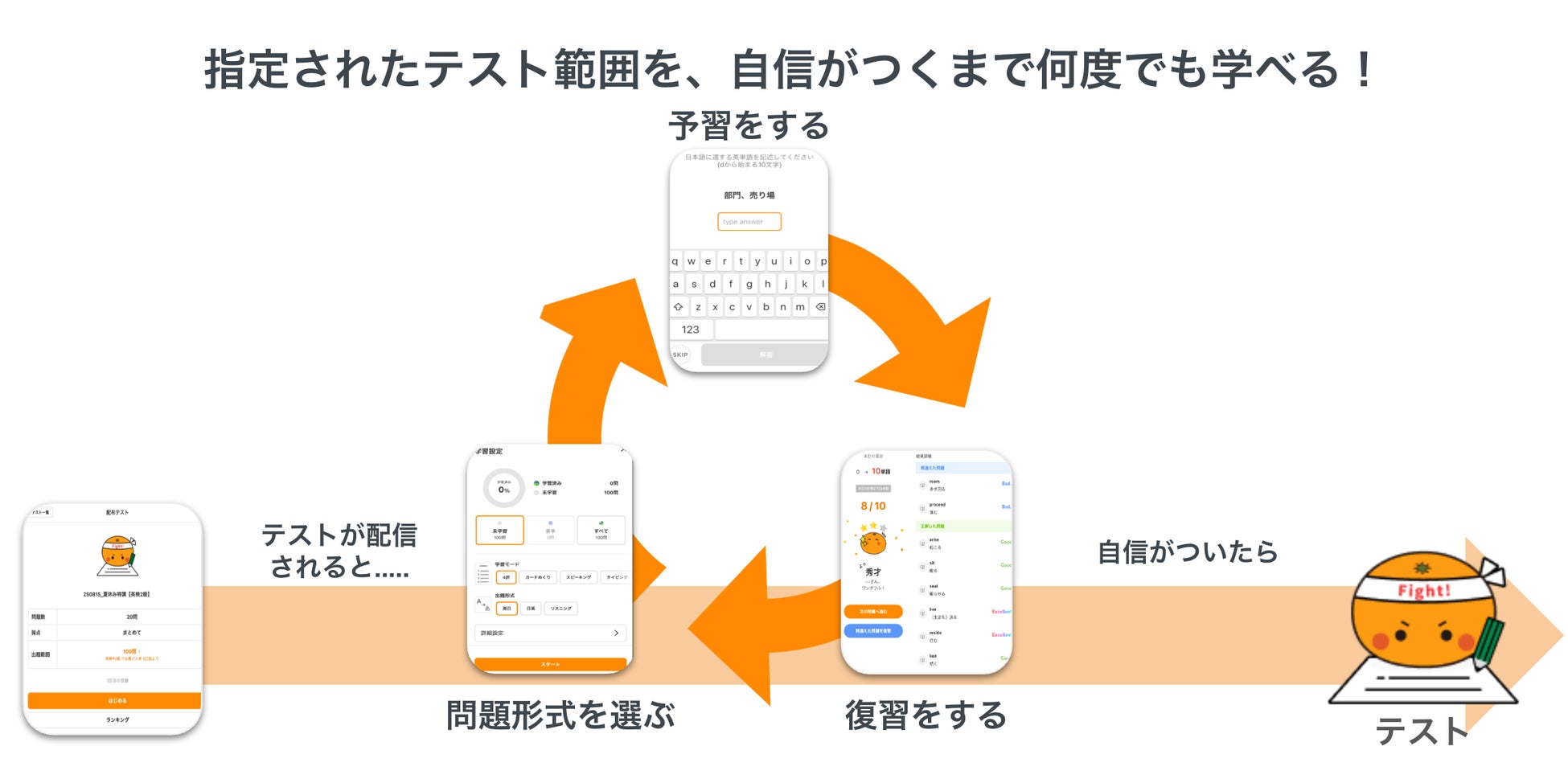 先生が作成したテストの出題範囲を、生徒がそのまま予習教材として学習できる機能です。先生の追加作業は一切不要。生徒はテスト画面から数タップで、テスト範囲の学習をすぐに始められます。