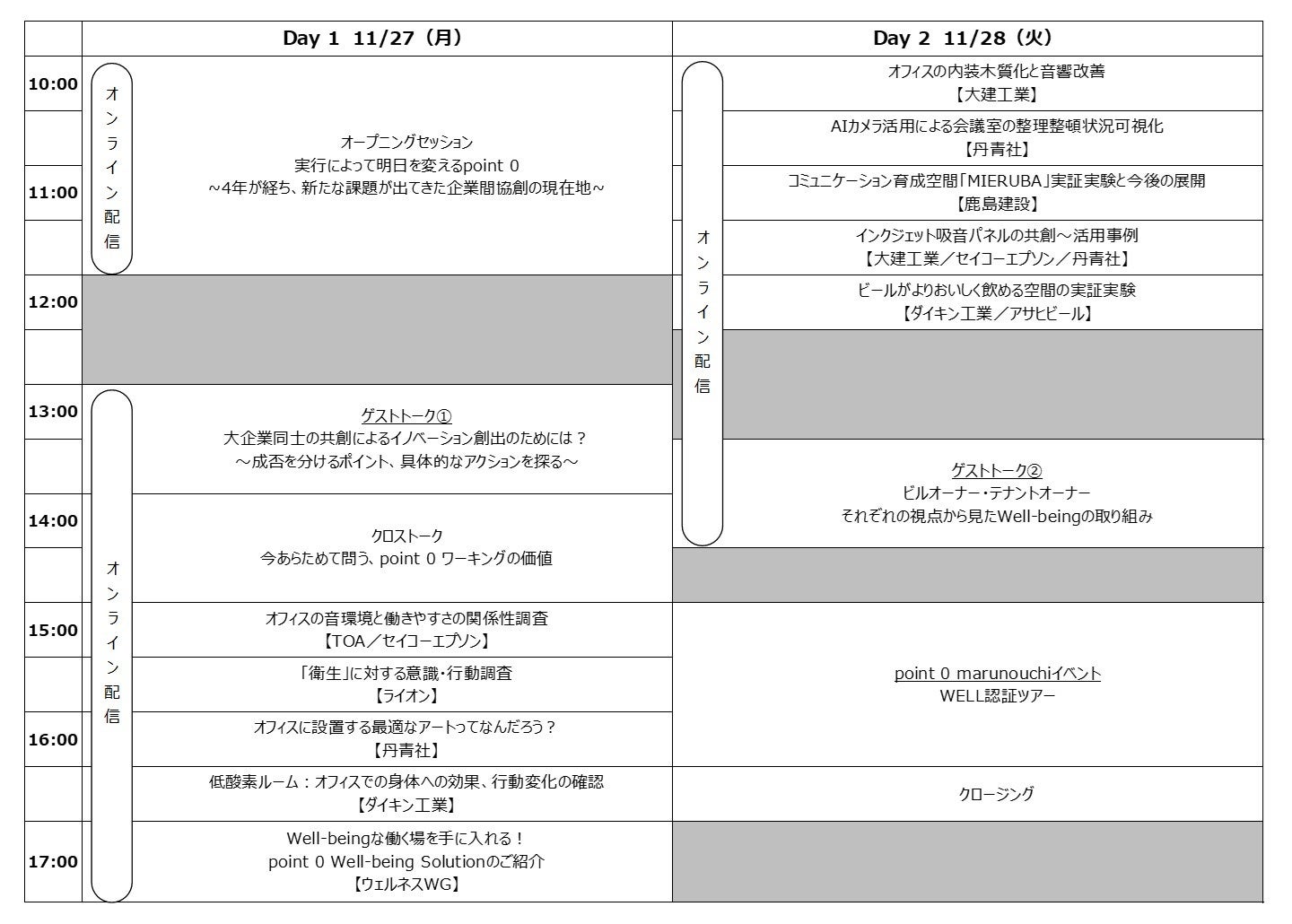 この1年間で得られたpoint 0の活動並びに今後の展開をはじめ、各界の最前線で活躍される方々をお招きしてのゲストトークセッション、実証実験の結果やpoint 0 が起点となり生まれたサービスの紹介等をお届けいたします。更に2021年1月に日本のコワーキングスペースとして初めて「WELL認証(WELL v2 pilot)」ゴールドランクを「point 0 marunouchi」が取得した経験・知見を活かしたサービスを紹介する「WELL認証ツアー」をオフラインで開催いたします。