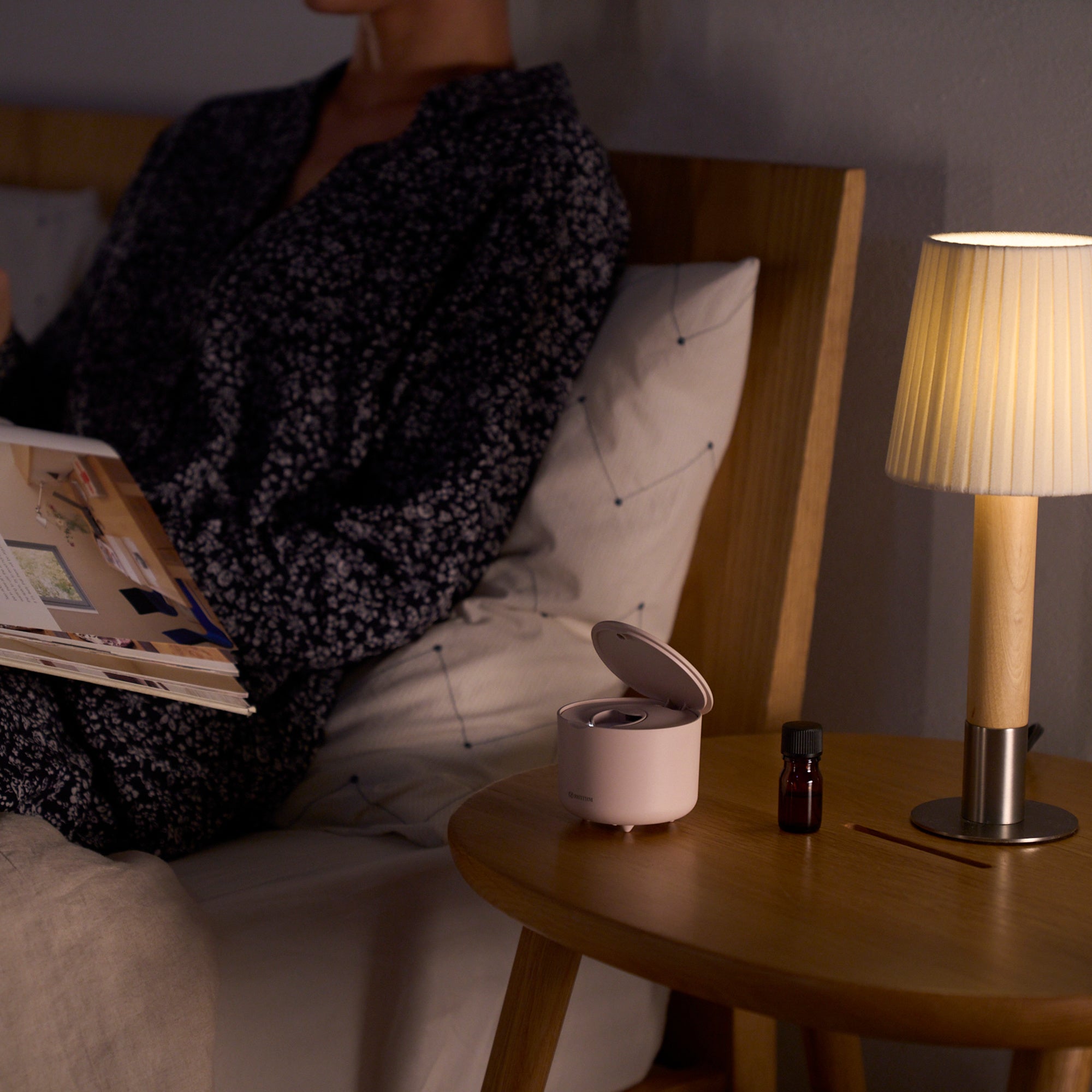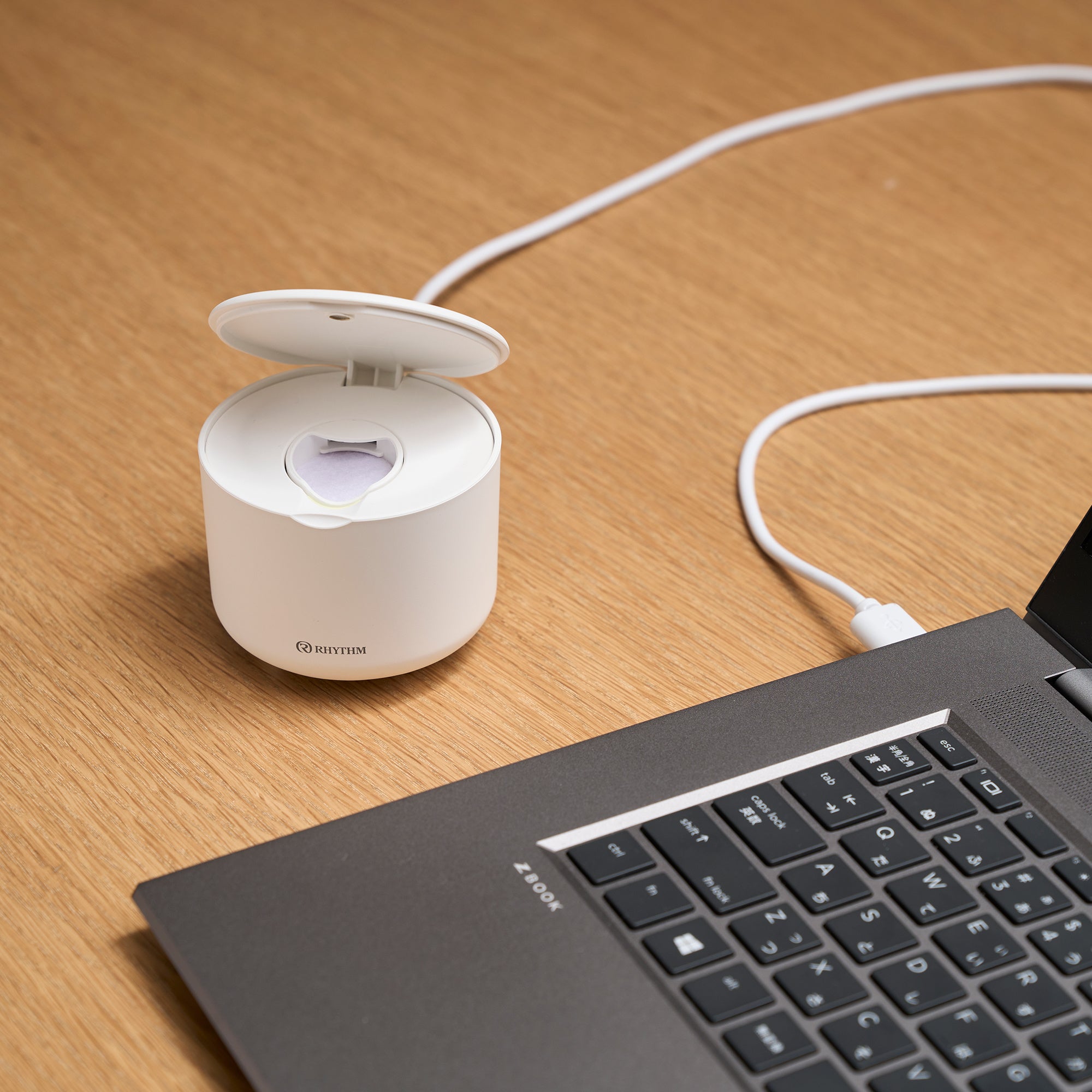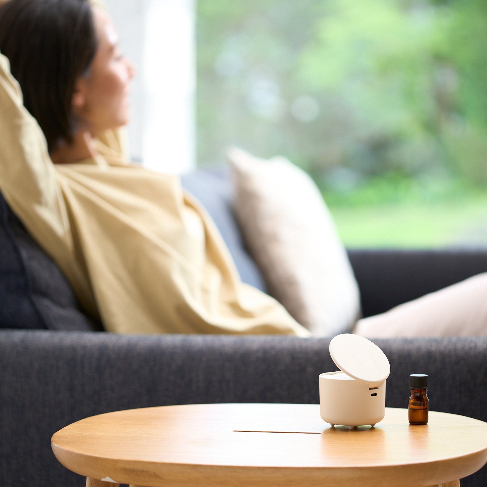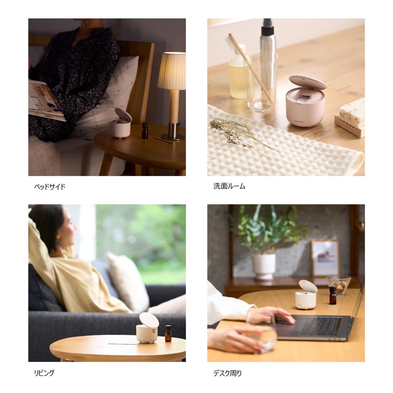 乾電池とUSB電源の2種類の使い分けができるので、さまざまな場所で天然の香りをお楽しみいただけます。ベッドサイドから洗面ルーム、リビング、デスク周りなど一日を過ごす場所に寄り添います。