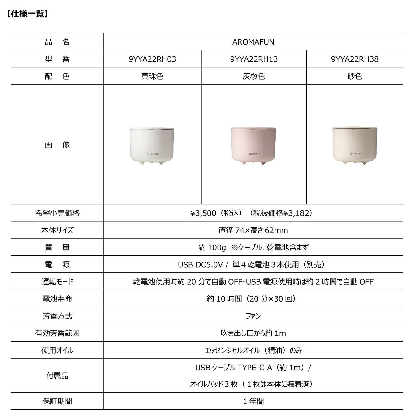 リズム株式会社(取締役社長 平田博美)は、手軽にアロマの香りを楽しめるファン式アロマディフューザー「AROMAFUN(アロマファン)」を8 月下旬より発売いたします。