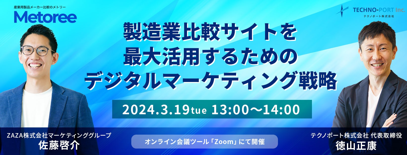 製造業向けのWebマーケティングサービスを提供する、テクノポート株式会社(本社:東京都港区、代表取締役:徳山 正康)は、製造業比較サイト「Metoree」を運営するZAZA株式会社と共催で、製造業比較サイトを最大活用するためのデジタルマーケティング戦略について解説するオンラインセミナーを開催いたします。