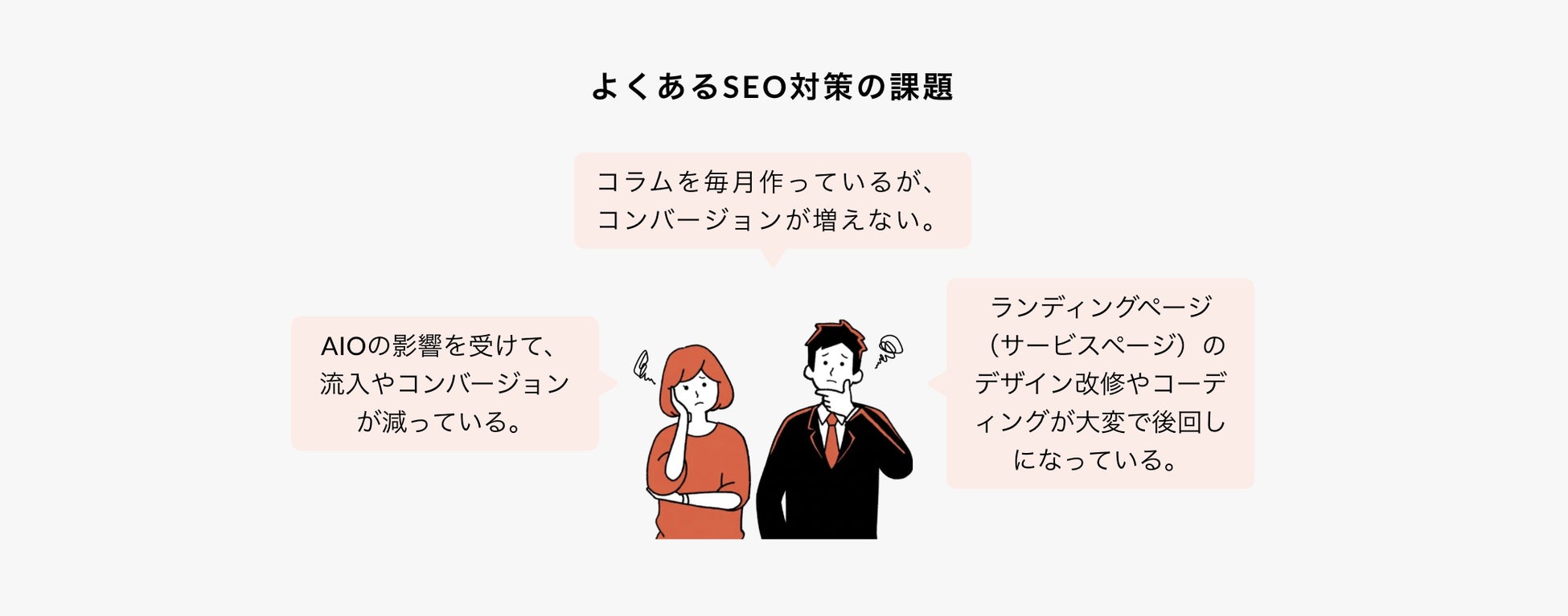 BtoB企業のマーケティングにおいて、ランディングページはCVや売上の中核です。しかし、「コラムを毎月作っているが、コンバージョンが増えない」「AIOの影響を受けて、流入やコンバージョンが減っている」「ランディングページ(サービスページ)のデザイン改修やコーディングが大変で後回しになっている」といった課題を抱える企業が増えています。