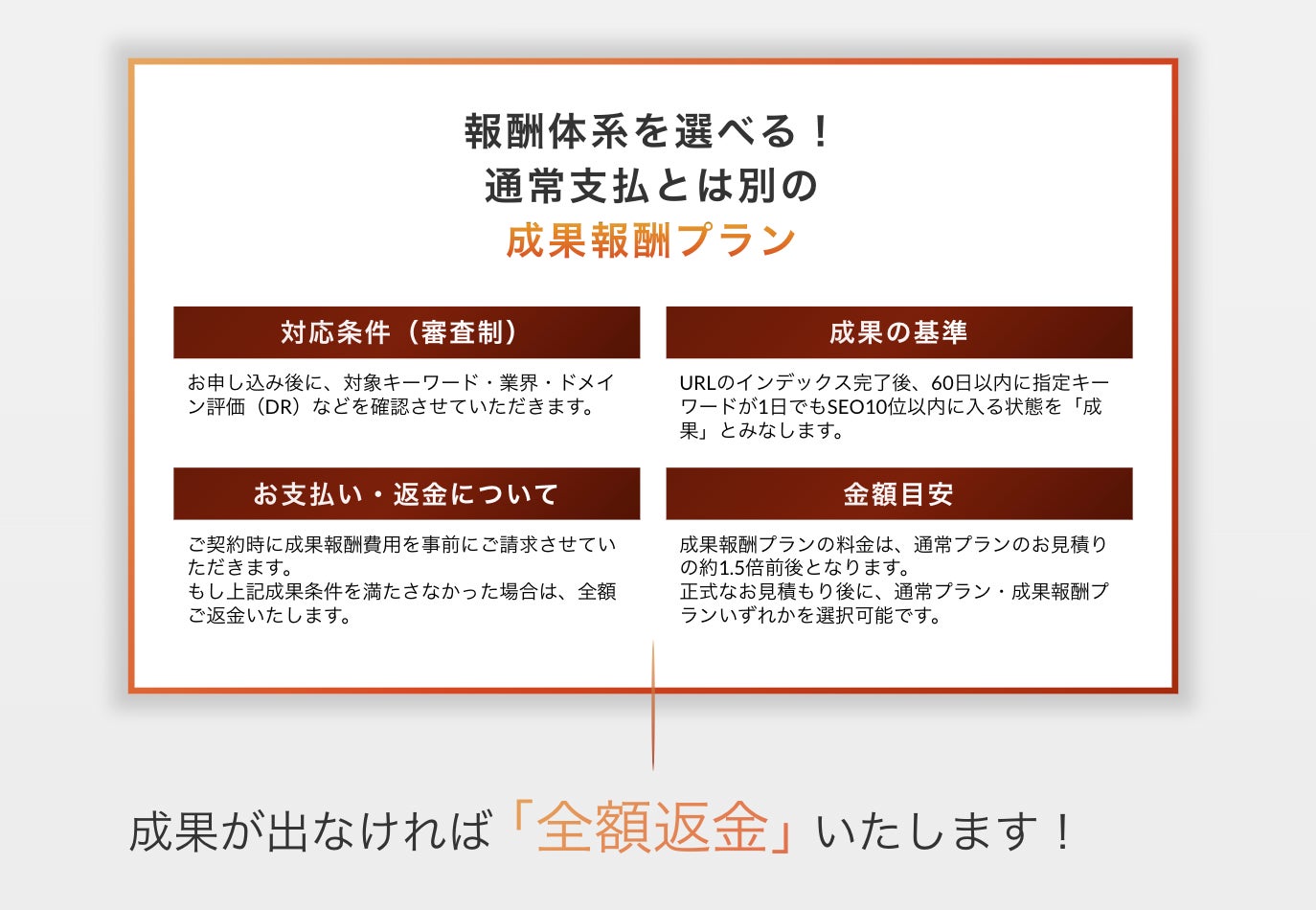 成果が出なければ「全額返金」の成果報酬プランを用意:通常支払プランに加え、成果報酬プランを提供。もし指定キーワードがSEO10位以内に入らなかった場合は、事前に請求した成果報酬費用を全額返金いたします。
