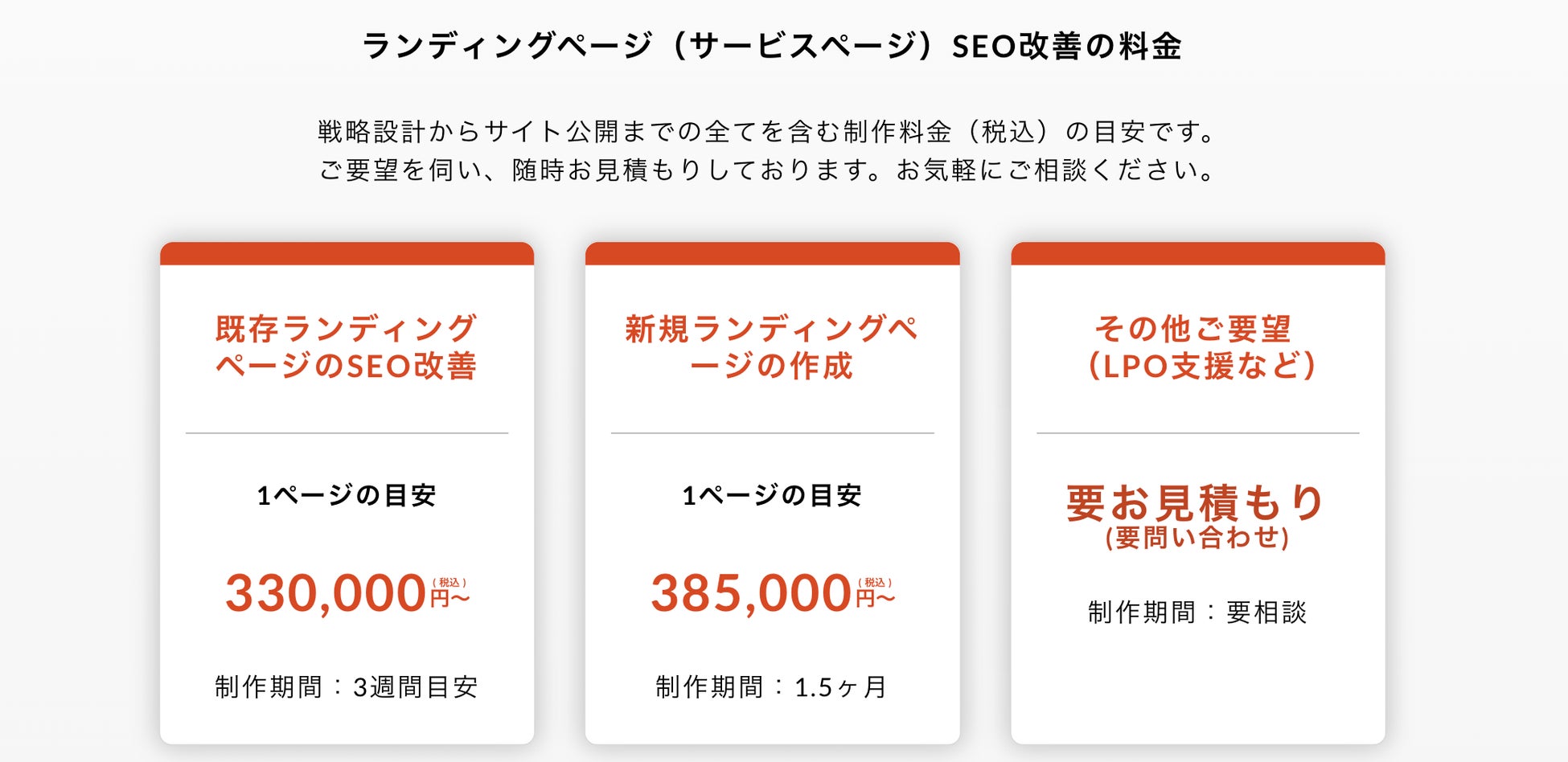 SEOとLP制作の両方に精通した専門メンバーが担当:SEOコンサルタントとデザイナーが別々に動くのではなく、SEOもデザインも開発もわかる担当がアサインされます。構造化マークアップまで最適化し、検索エンジンに理解されるサイトを構築します。