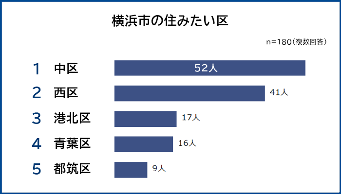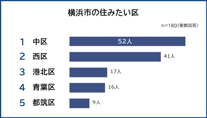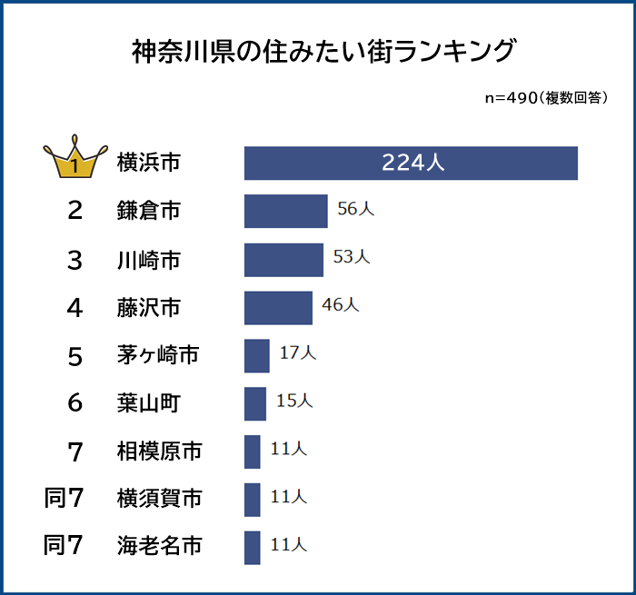 全国の男女490人に「神奈川県内の住みたい街」を聞いたところ、1位は「横浜市(224人)」でした。