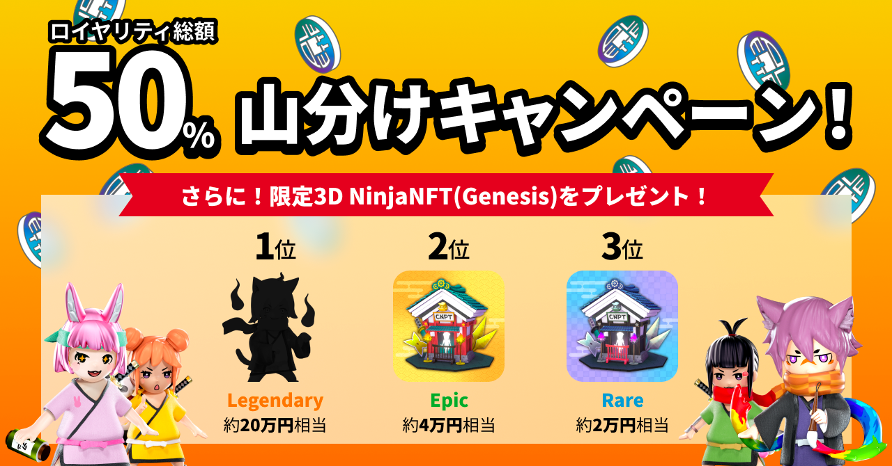PLT Placeの二次流通機能リリースを記念して、CryptoNinja Party! NFTのロイヤリティ手数料(販売価格の7.5%)の50%を山分けいたします!さらにCryptoNinja Party! NFTの二次流通取引高の上位3名様を対象に、限定3DNinjaNFT(Genesis)をプレゼント!