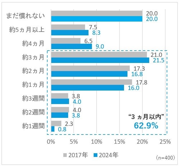 また、「約2ヵ月」(16.8%)や「約1ヵ月」(16.0%)といった短い期間で慣れたと感じる人も多く、全体の62.9%が“3ヵ月以内”に職場に慣れたと回答しました。