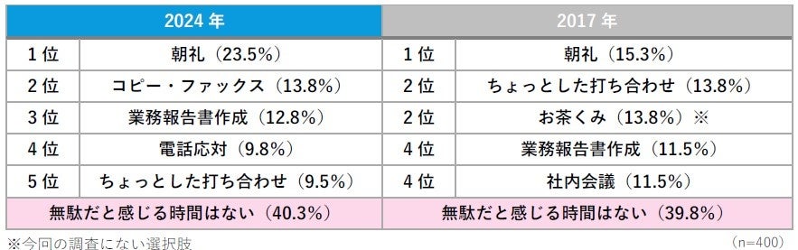 「朝礼」が最も多く、23.5%が無駄だと感じていると回答しました。これは2017年の15.3%から大幅に増加しており、朝礼の必要性に対する意識が変化していることが伺えます。コロナ禍でテレワークや時差出勤を導入した企業が多く、社員が一堂に集まる機会が減ったことにより、朝礼の必要性を感じにくくなっているのかもしれません。