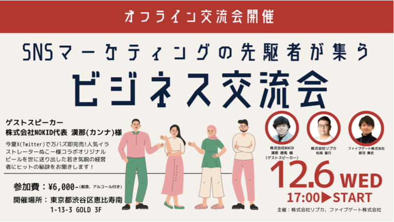 株式会社リプカとファイブゲート株式会社は、12月6日(水)に「SNSマーケティングの先駆者が集うビジネス交流会」を開催いたします。
