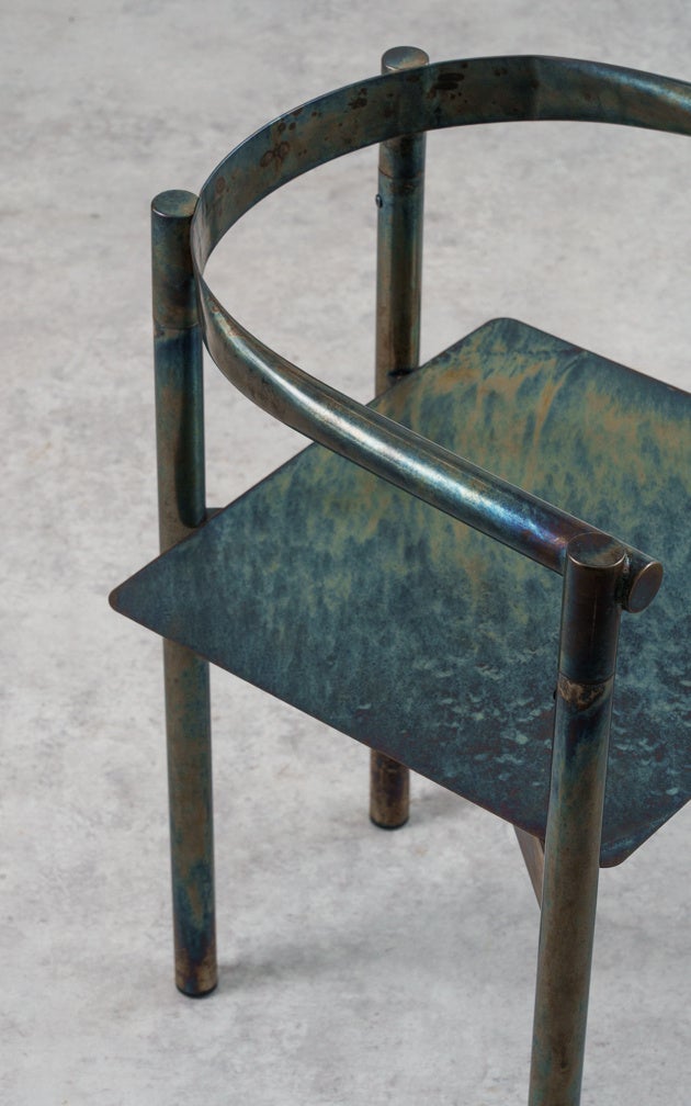 東京を拠点に活動するプロダクトデザイナー川本真也は、一般的に家具でよく使われる丸パイプの一部に「潰し」加工をし快適性を加えた椅子に、唯一無二の色味を表現することができる塩浴着色処理を用いて実験的な着色を行った、新作のオリジナルデザイン家具“PF Chair / PF Armchair”を発表。ステンレスの種類、板厚、冷却の速度により色柄の表情が異り、アート作品の様に美しいこの椅子は、梱包効率を考慮した分解・組立可能な構造も特徴です。