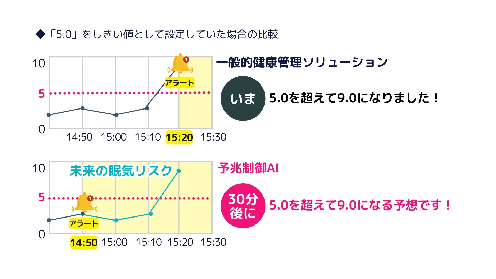 一般的な健康管理ソリューションは、「“実測値”が設定値を“超えた”とき」に警告を発します。これに対し予兆制御AIは、「“予測値”が設定値を“超えそうな”とき」に警告を発します。これが「未来の眠気リスク」です。