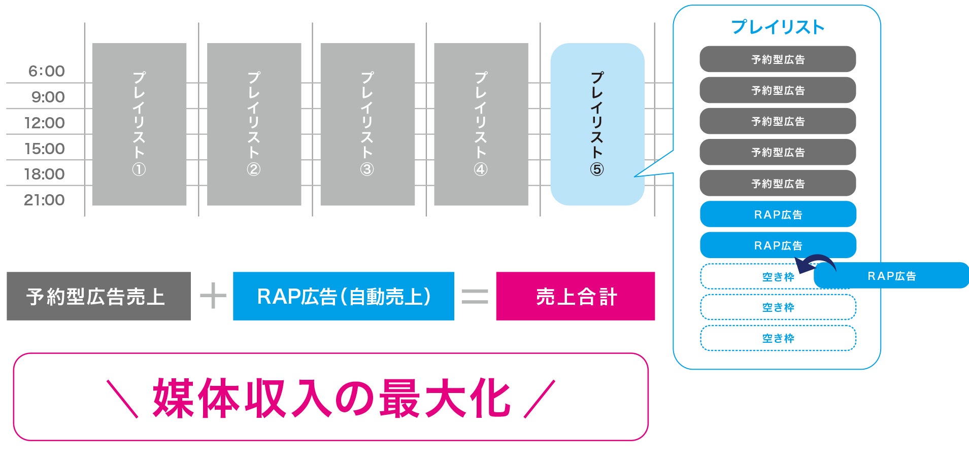 特に、複数の店舗や地域の情報を統計化し、マッチング強化や自動買い付けを容易にできることがRAPの大きな特徴です。さらに、プレイリスト内の空き枠を効率的に広告媒体として活用し、収益化へつなげる機能も備えています。