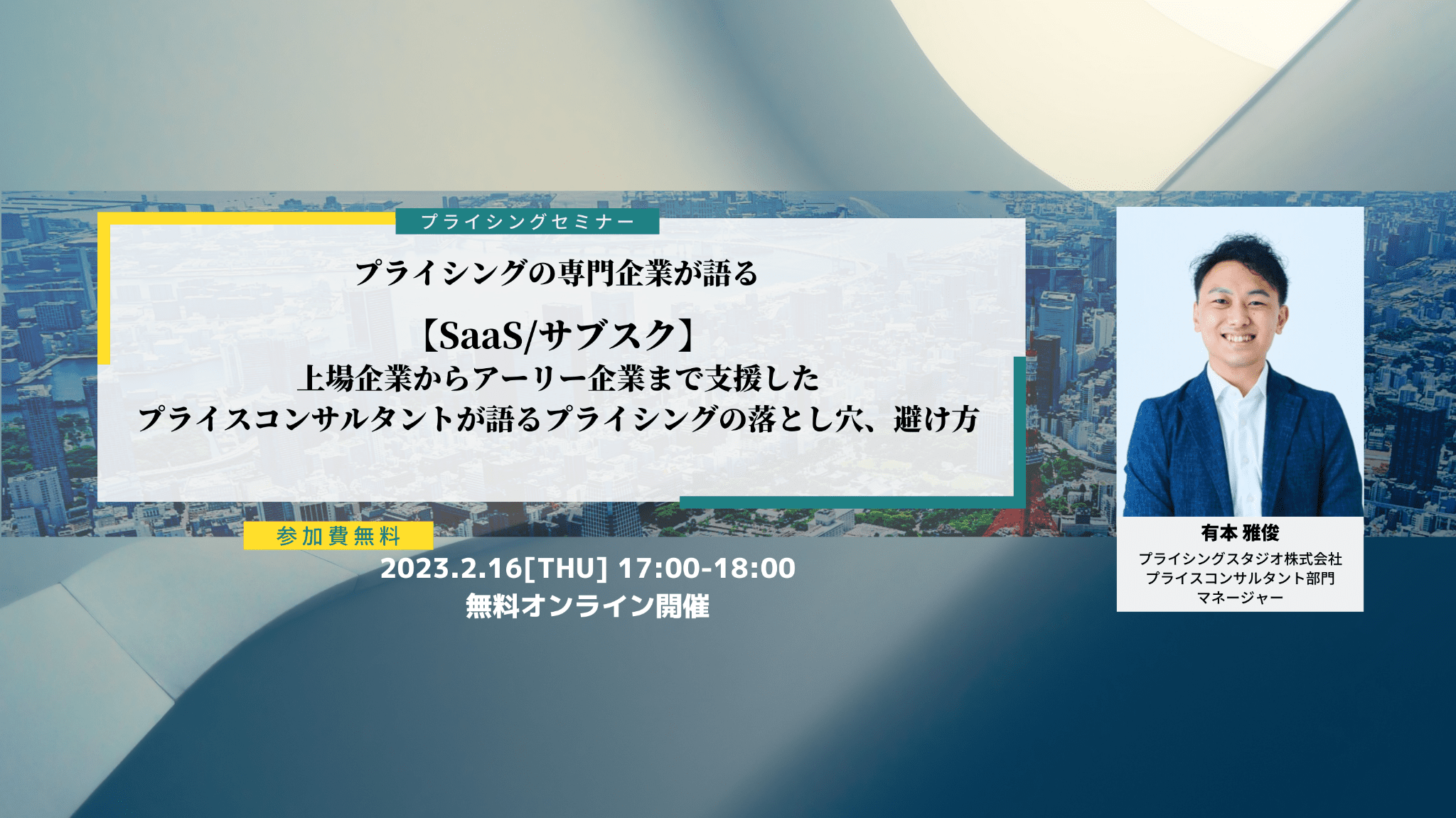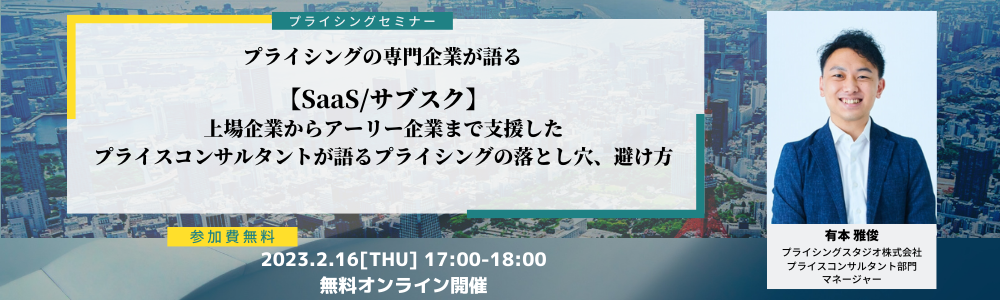 プライシングスタジオ株式会社(本社:東京都港区、代表取締役:高橋 嘉尋)は、無料オンラインセミナー【SaaS/サブスク】上場企業からアーリー企業まで支援したプライスコンサルタントが語るプライシングの落とし穴、避け方のセミナーを2月16日(木)17時に開催いたします。