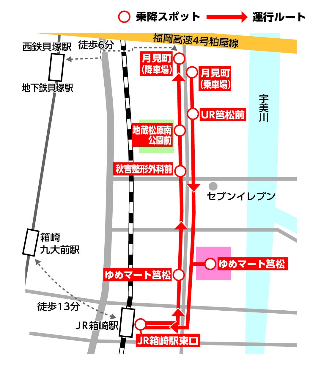 ○走行ルート:表面記載の図のとおり。JR箱崎駅周辺エリアを各乗降スポットに停車しながら走行。