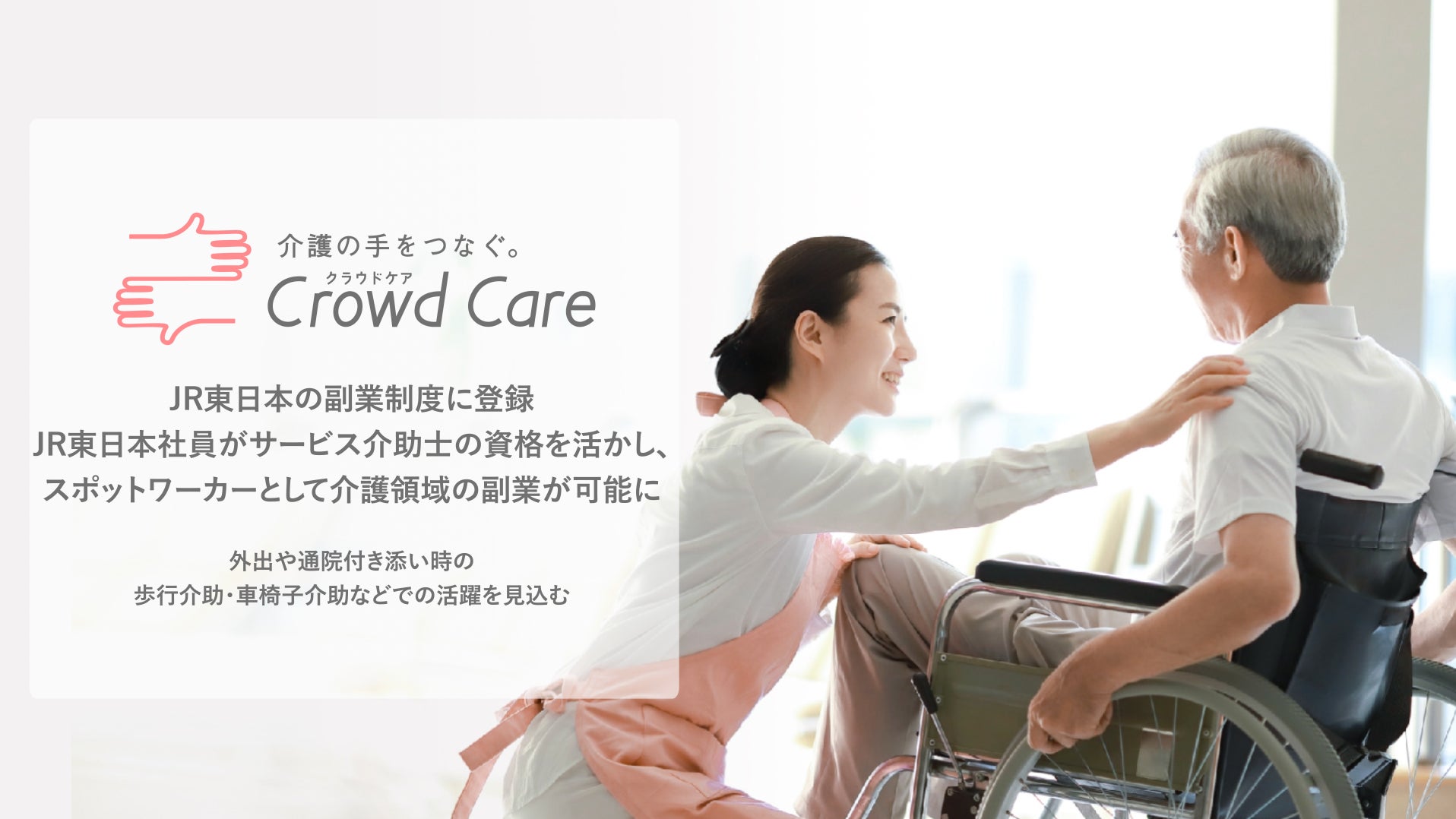 ネットで簡単に頼める訪問介護・家事・生活支援サービス「Crowd Care(クラウドケア)」を運営する株式会社クラウドケア(本社:東京都渋谷区、代表取締役CEO:小嶋潤一)は、JR東日本が、社員のさまざまなチャレンジに応えられるように設けられた副業制度内(※1)の副業先に登録されたことをお知らせいたします。当取り組みにより、サービス介助士(※2)の資格を持つJR東日本の社員が、1回1時間からなど、短時間・スポットで、クラウドケアのヘルパーとして保険外の介護サービスを提供可能となります。外出や通院付き添い時の移動の介助(歩行介助・車椅子介助など)といったニーズに対応し、介護領域において即戦力としての活躍を見込んでいます。