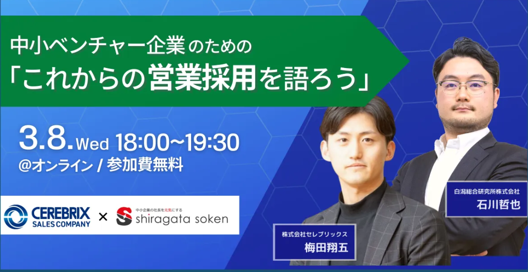 【3月8日(水)18:00〜】株式会社セレブリックスと白潟総研が、共催ウェビナー「中小ベンチャー企業のための『これからの営業採用を語ろう』」を実施