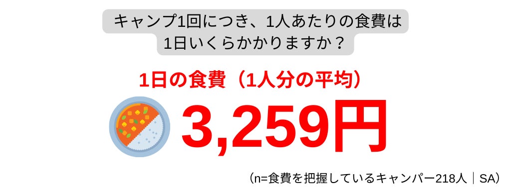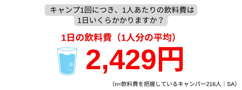 キャンプにかかる食費については、1人平均3,259円/日で、そのうち飲料費が1人平均2,429円/日という結果に。食費の大部分を飲料費が占めていることがわかりました。