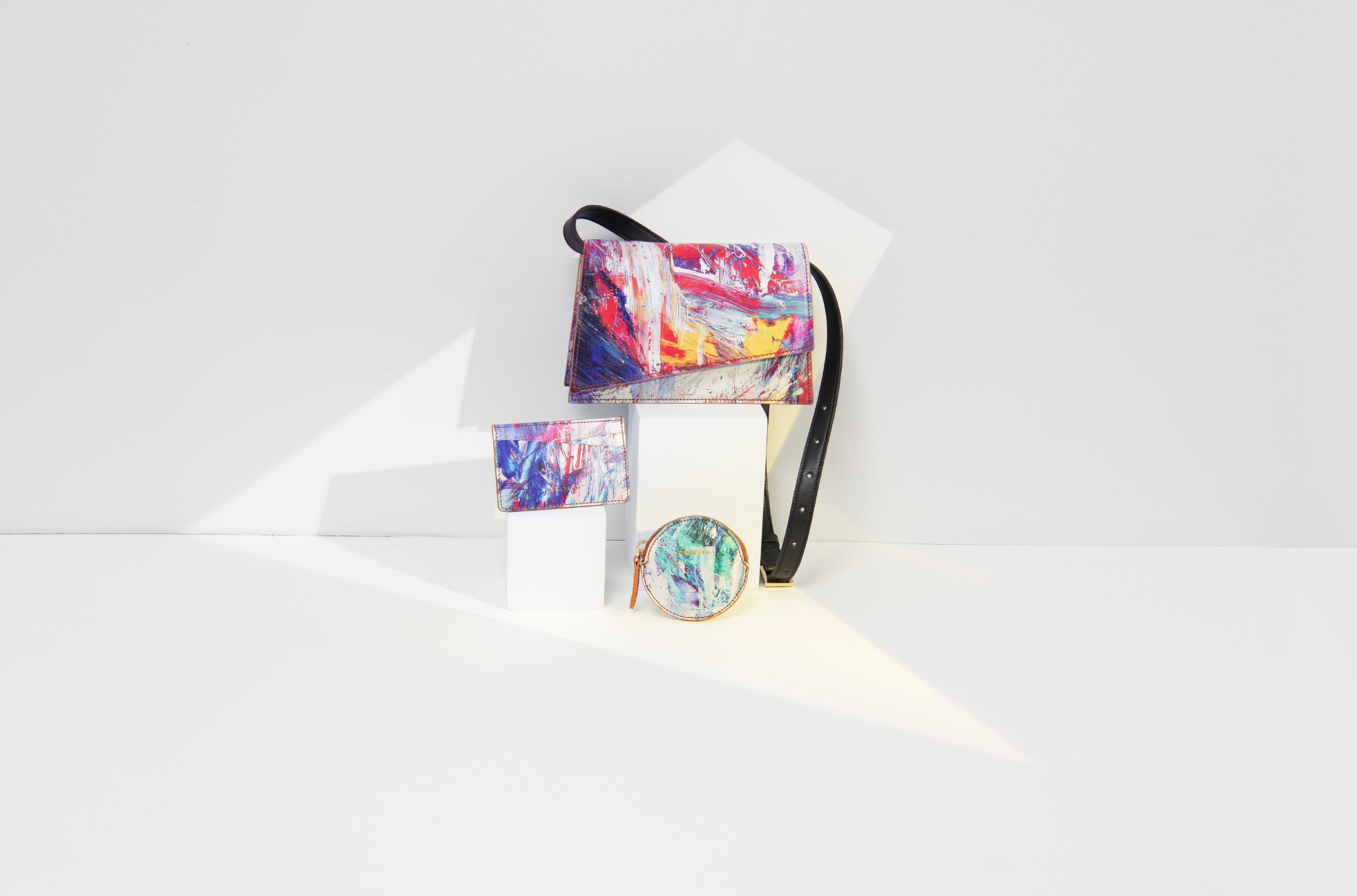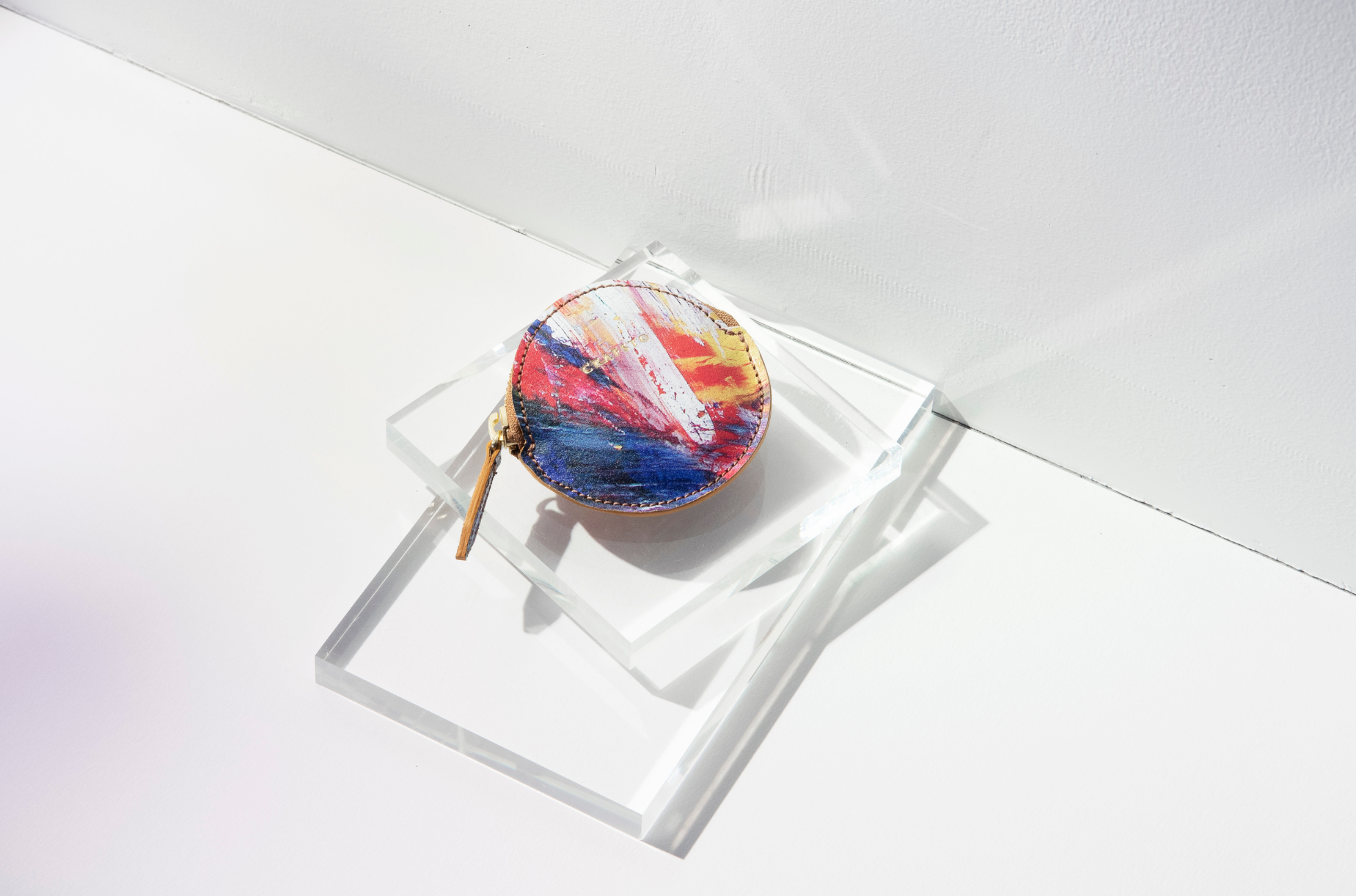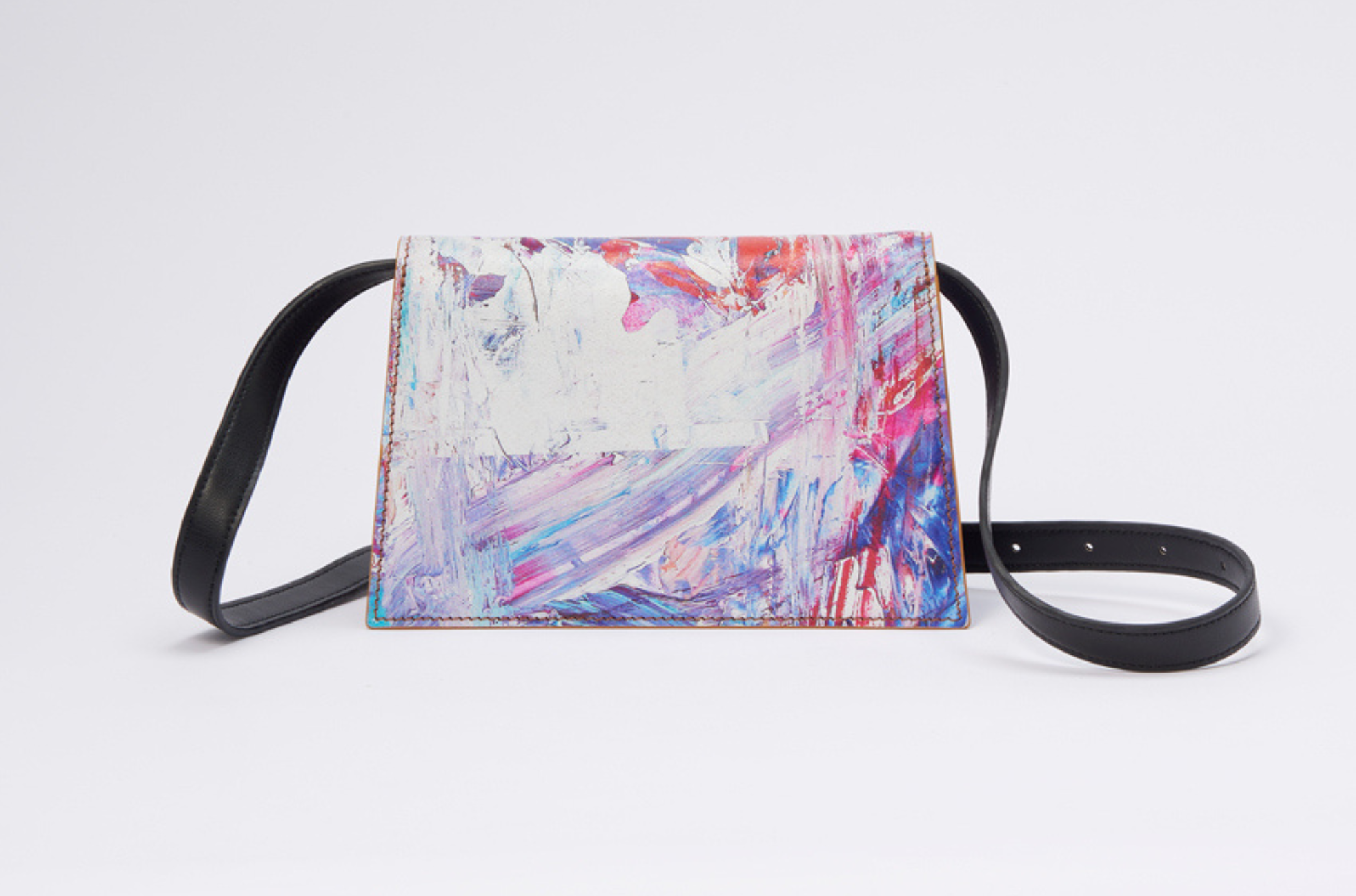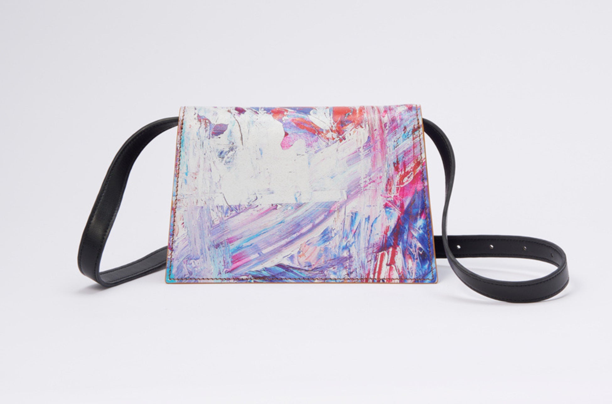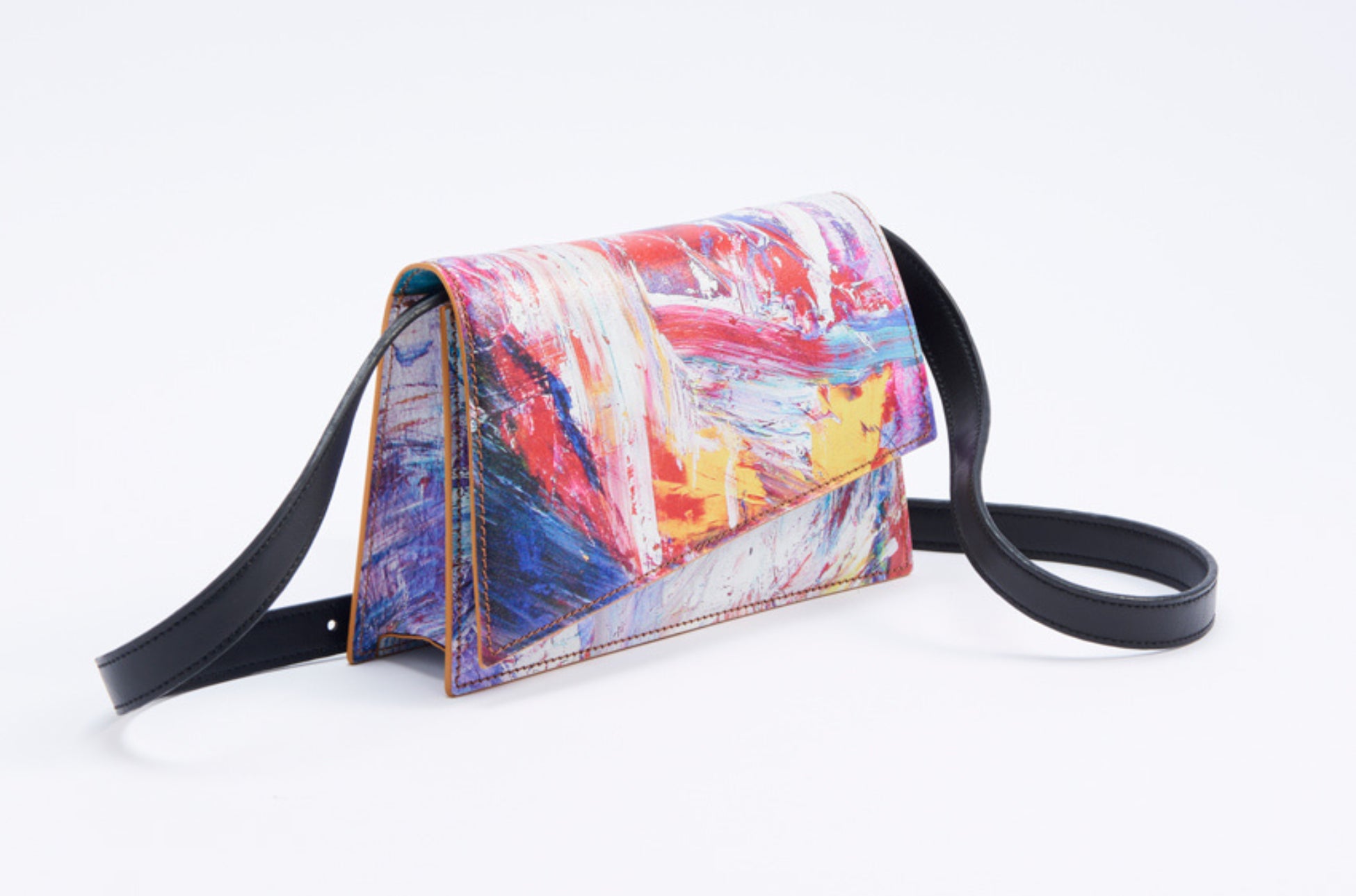 そして、必要最低限のものを入れてお出かけする際に便利な、アジャスト可能なショルダーがついたミニショルダーバッグ。製品制作の過程で出る床革(廃材)を再利用し、革の表面にLGBTQをテーマに描いたグラフィックプリントがあしらわれています。