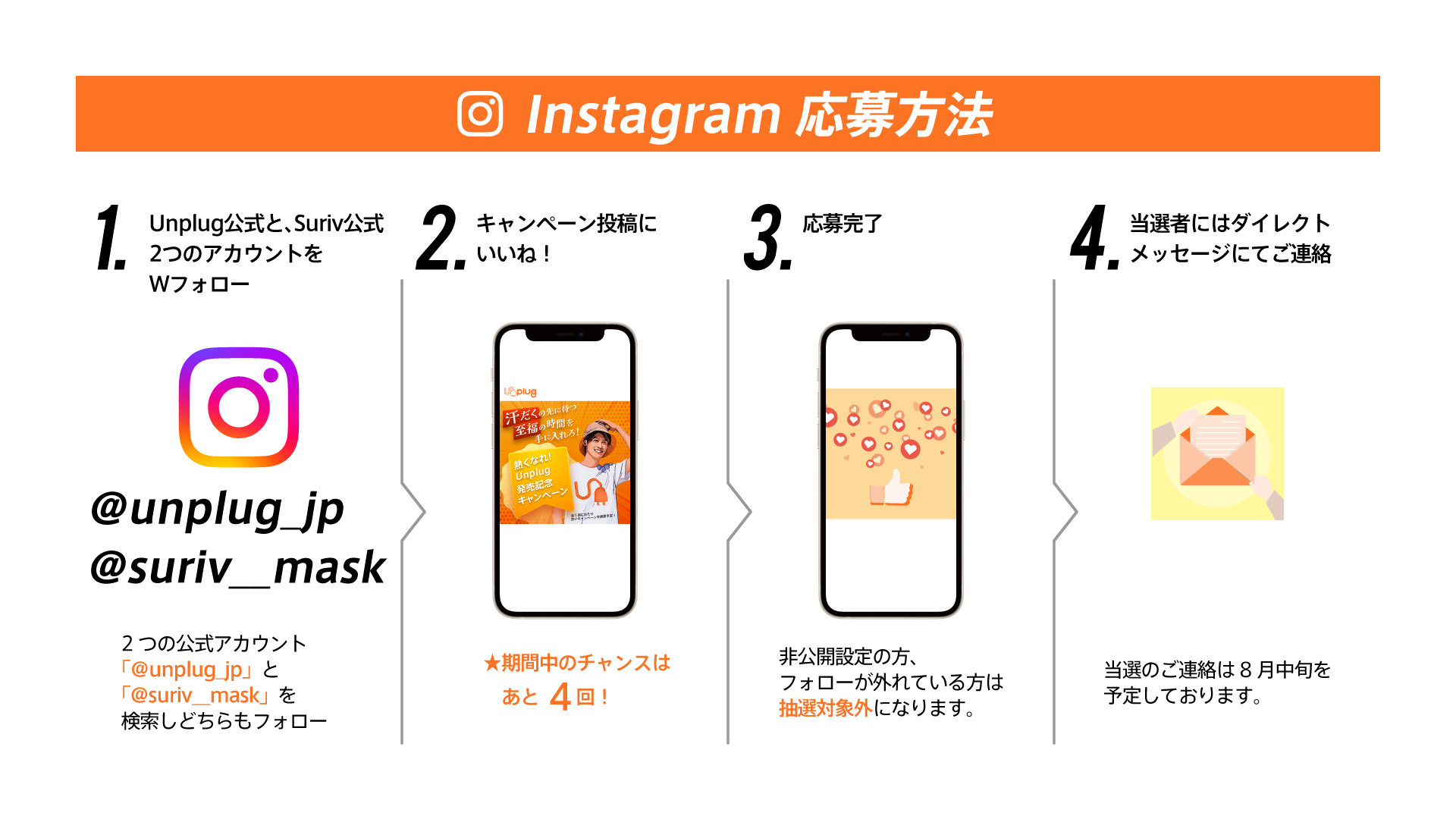 ①Unplug|アンプラグ公式(@unplug_jp)と、Suriv|スリーヴ公式(@suriv__mask)のアカウントをWフォロー(※すでにフォローいただいている方も対象です)