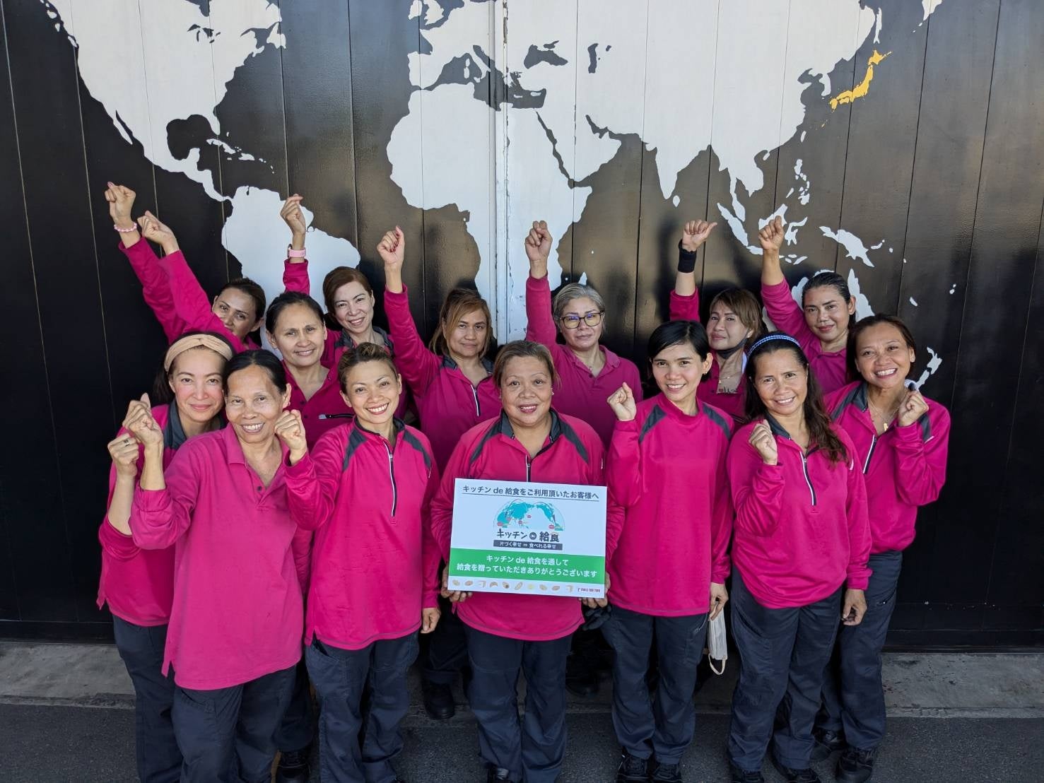 ▲キッチンde給食選別センターで働くフィリピン人女性スタッフ集合